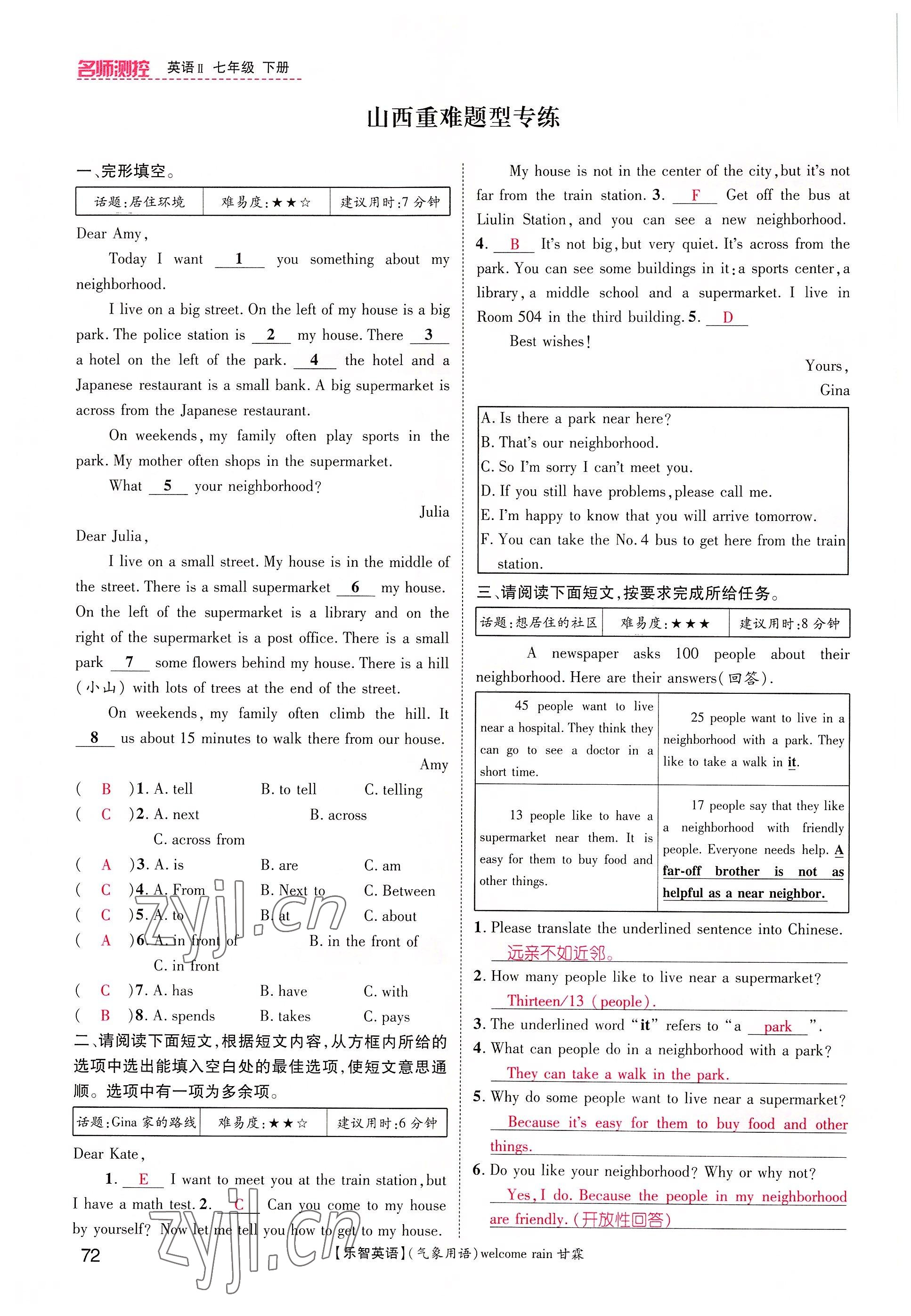 注:目前有些书本章节名称可能整理的还不是很完善,但都是按照顺序排列的,请同学们按照顺序仔细查找。练习册 2022年名师测控七年级英语下册人教版山西专版 答案主要是用来给同学们做完题方便对答案用的,请勿直接抄袭。