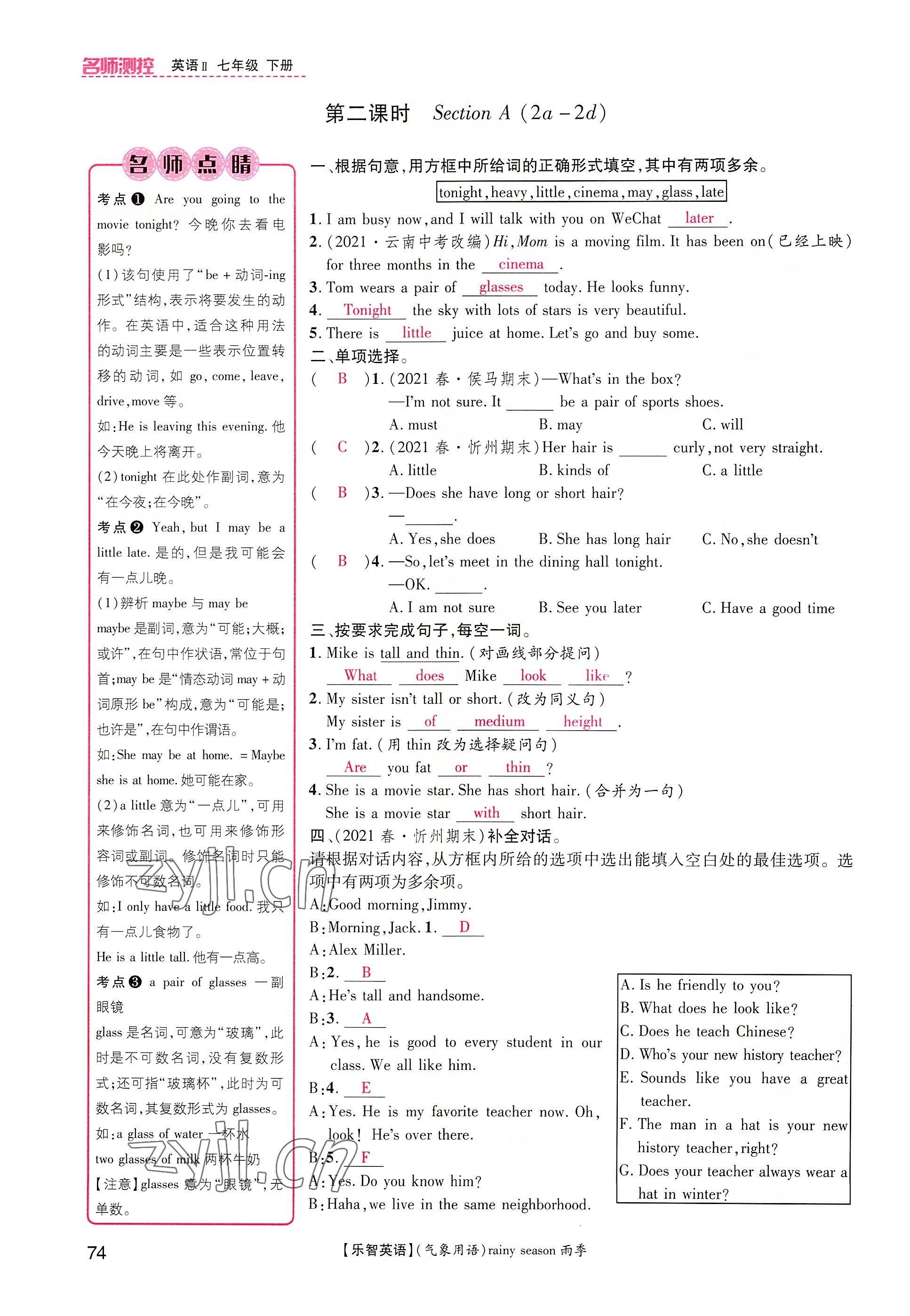 注:目前有些书本章节名称可能整理的还不是很完善,但都是按照顺序排列的,请同学们按照顺序仔细查找。练习册 2022年名师测控七年级英语下册人教版山西专版 答案主要是用来给同学们做完题方便对答案用的,请勿直接抄袭。