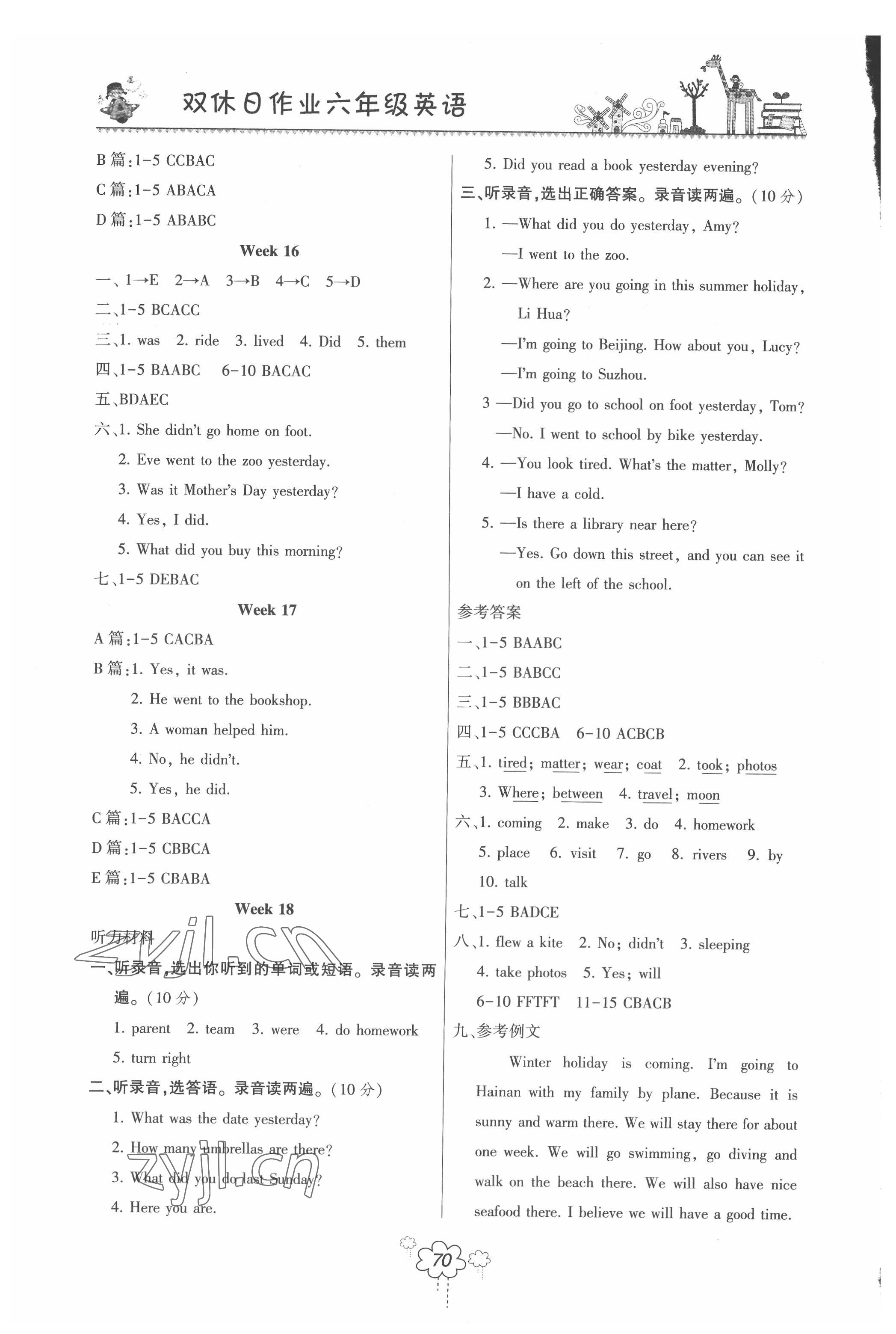 注:目前有些书本章节名称可能整理的还不是很完善,但都是按照顺序排列的,请同学们按照顺序仔细查找。练习册 2022年双休日作业河南人民出版社六年级英语下册人教版 答案主要是用来给同学们做完题方便对答案用的,请勿直接抄袭。