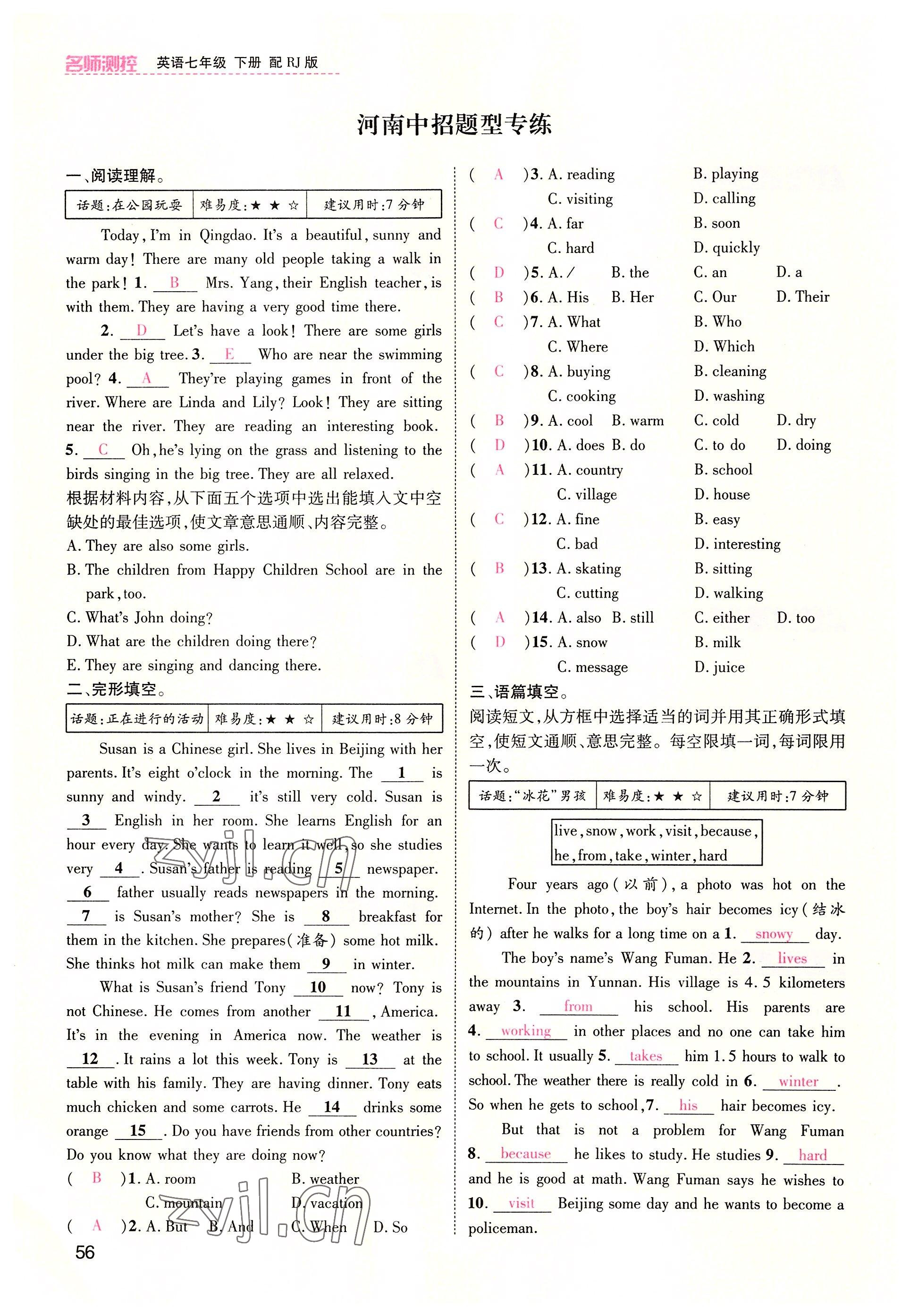 注:目前有些书本章节名称可能整理的还不是很完善,但都是按照顺序排列的,请同学们按照顺序仔细查找。练习册 2022年名师测控七年级英语下册人教版河南专版 答案主要是用来给同学们做完题方便对答案用的,请勿直接抄袭。
