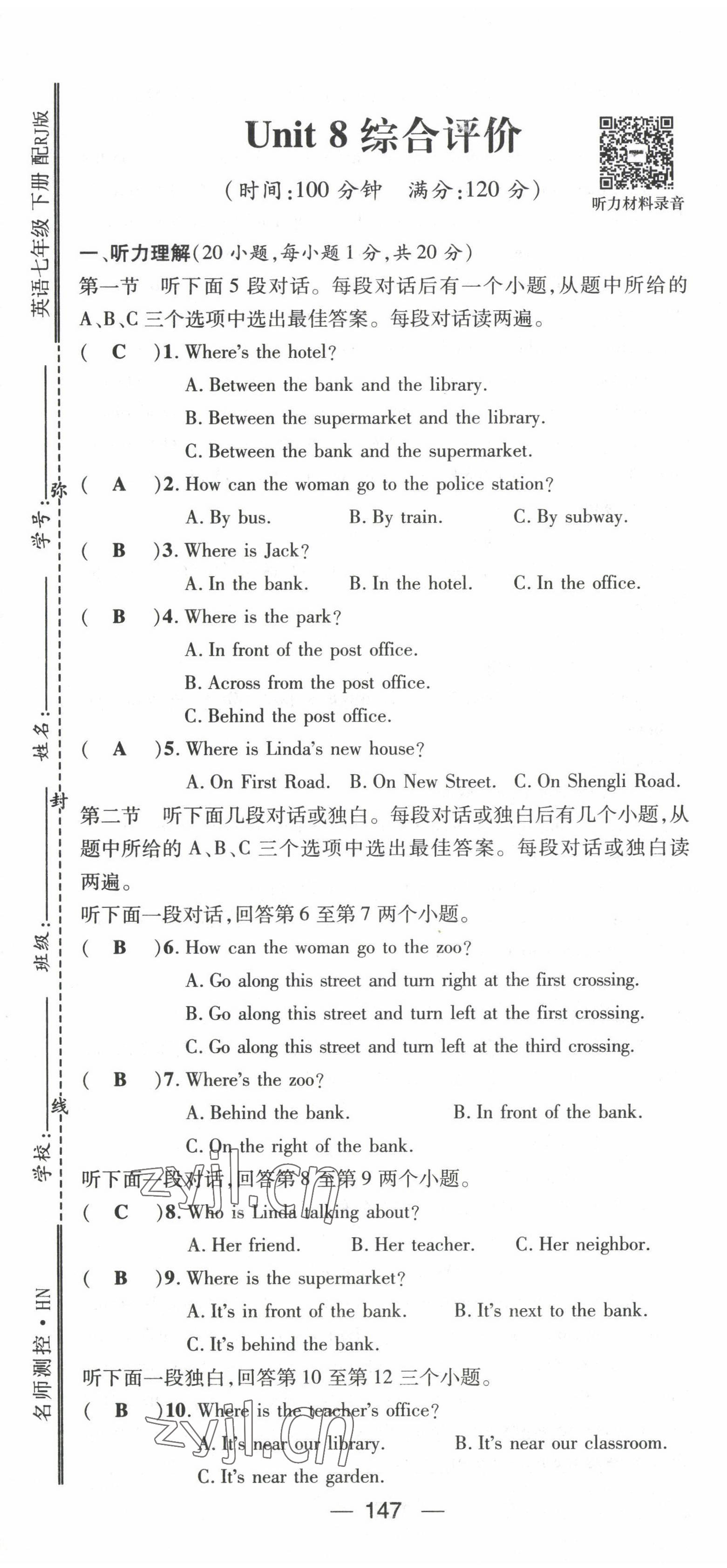 注:目前有些书本章节名称可能整理的还不是很完善,但都是按照顺序排列的,请同学们按照顺序仔细查找。练习册 2022年名师测控七年级英语下册人教版河南专版 答案主要是用来给同学们做完题方便对答案用的,请勿直接抄袭。