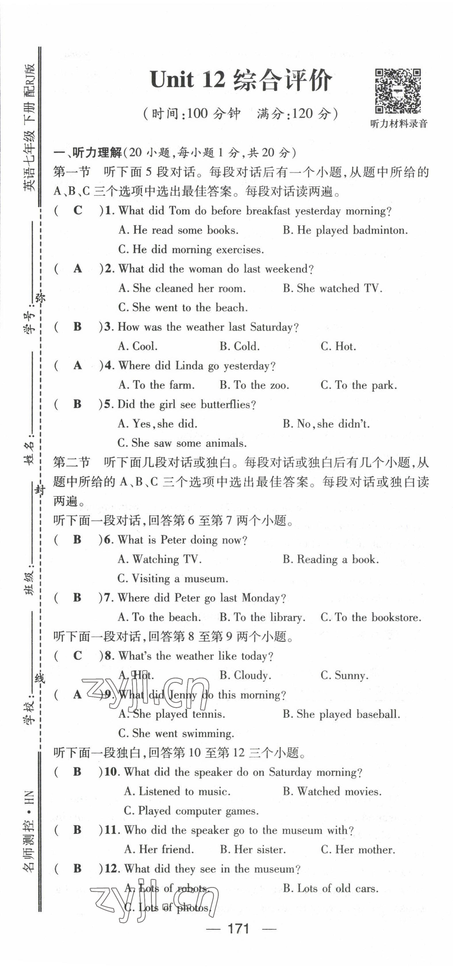 注:目前有些书本章节名称可能整理的还不是很完善,但都是按照顺序排列的,请同学们按照顺序仔细查找。练习册 2022年名师测控七年级英语下册人教版河南专版 答案主要是用来给同学们做完题方便对答案用的,请勿直接抄袭。