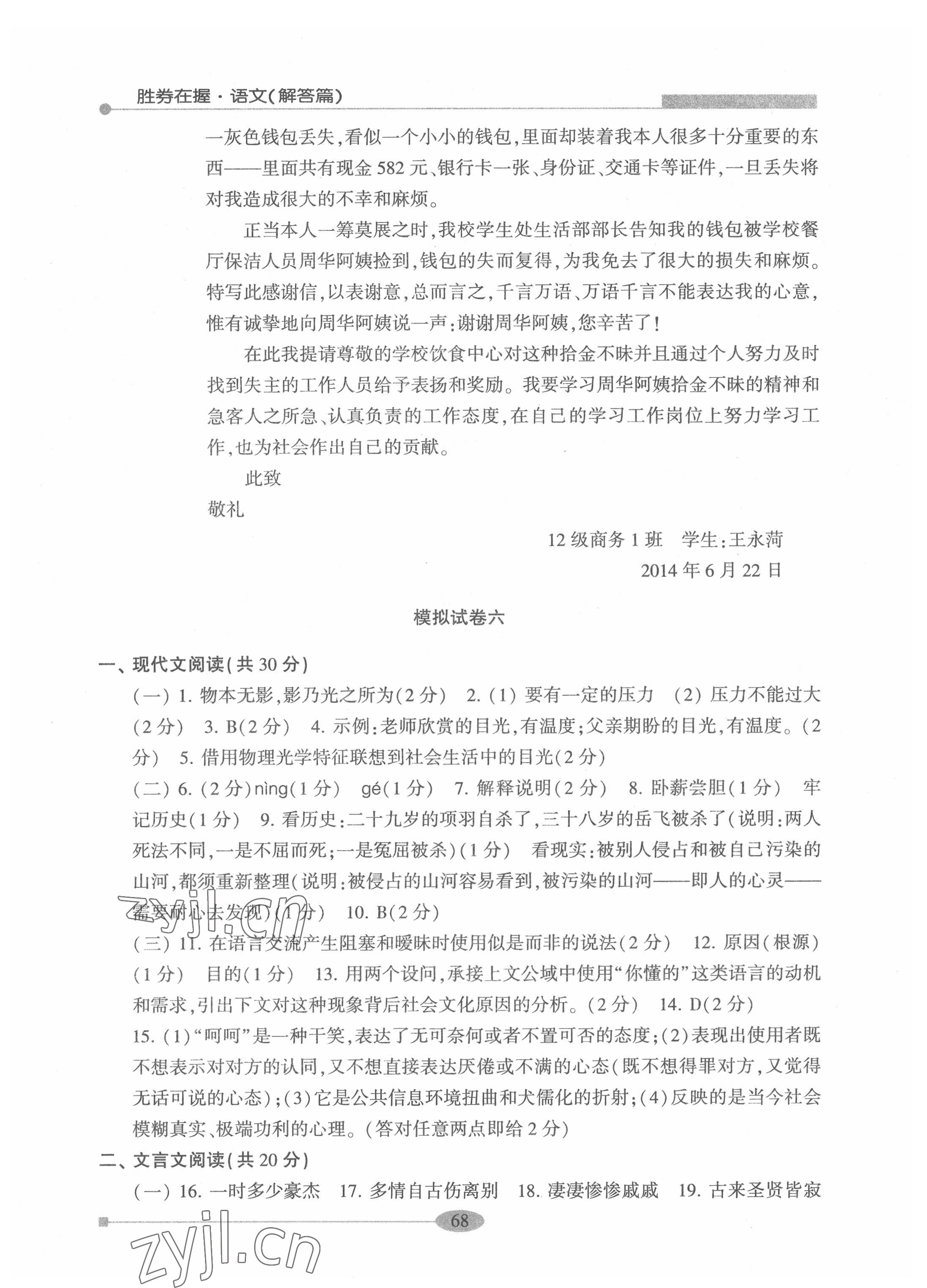 注:目前有些书本章节名称可能整理的还不是很完善,但都是按照顺序排列的,请同学们按照顺序仔细查找。练习册 2022年胜券在握中考总复习指导语文 答案主要是用来给同学们做完题方便对答案用的,请勿直接抄袭。