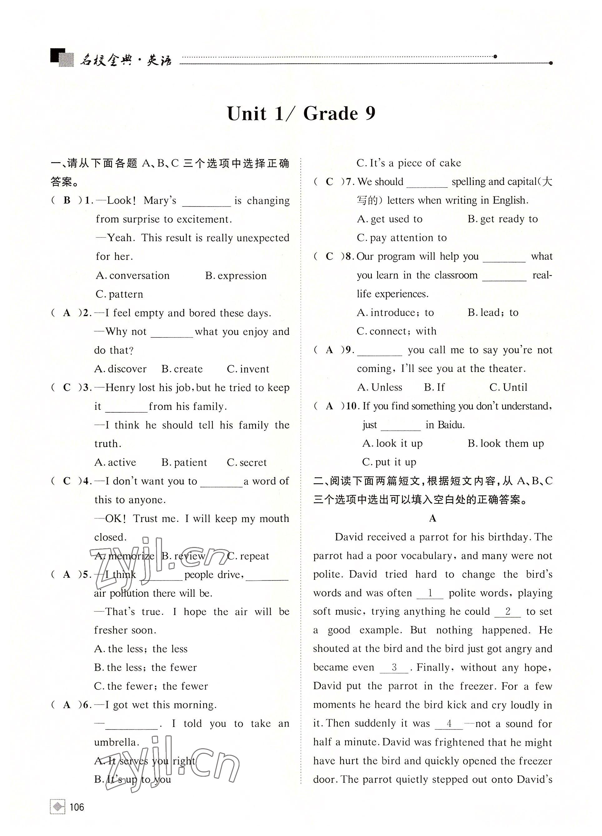注:目前有些书本章节名称可能整理的还不是很完善,但都是按照顺序排列的,请同学们按照顺序仔细查找。练习册 2022年名校金典课堂中考总复习英语成都专版 答案主要是用来给同学们做完题方便对答案用的,请勿直接抄袭。