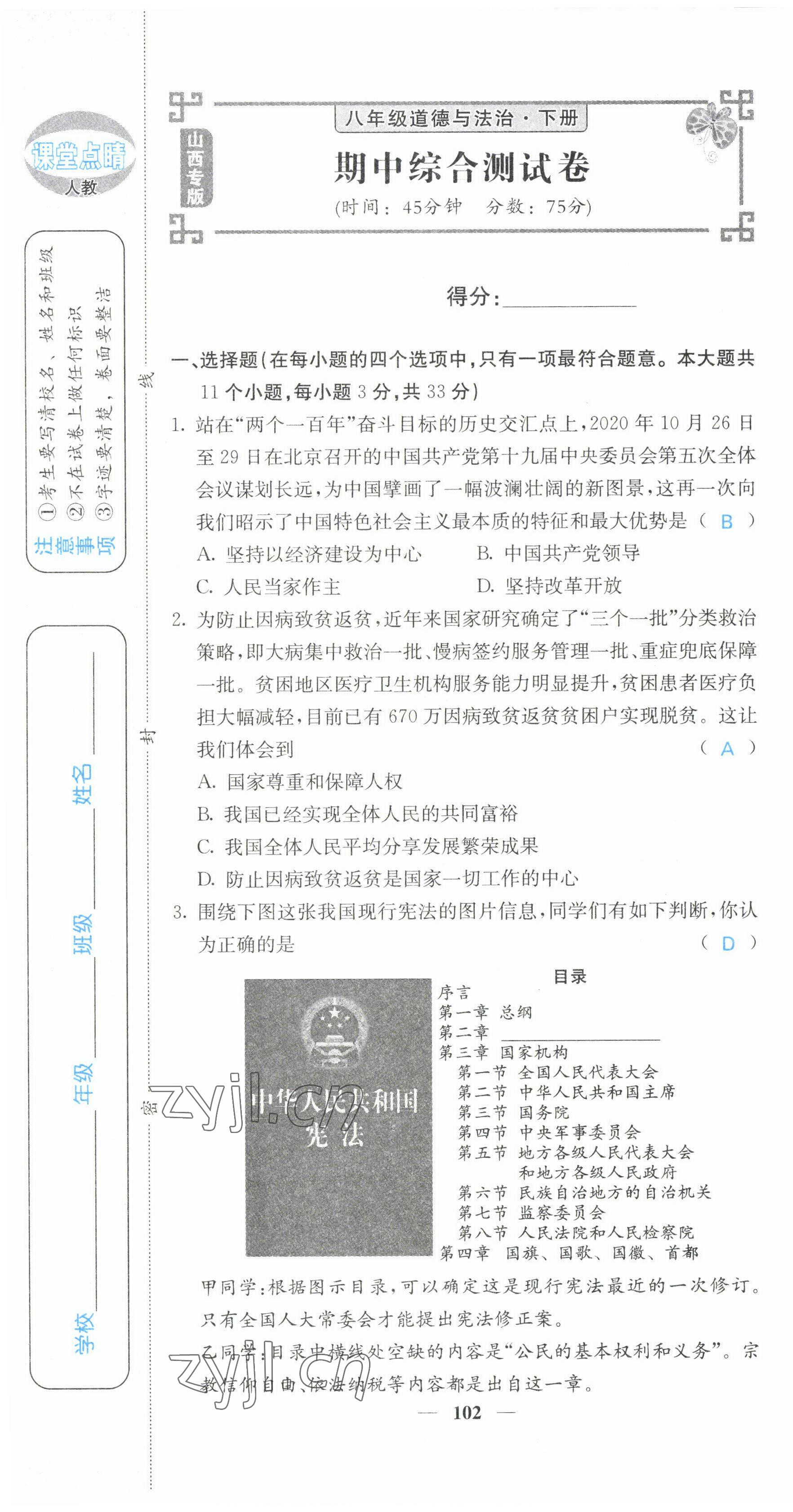 注:目前有些书本章节名称可能整理的还不是很完善,但都是按照顺序排列的,请同学们按照顺序仔细查找。练习册 2022年课堂点睛八年级道德与法治下册人教版山西专版 答案主要是用来给同学们做完题方便对答案用的,请勿直接抄袭。