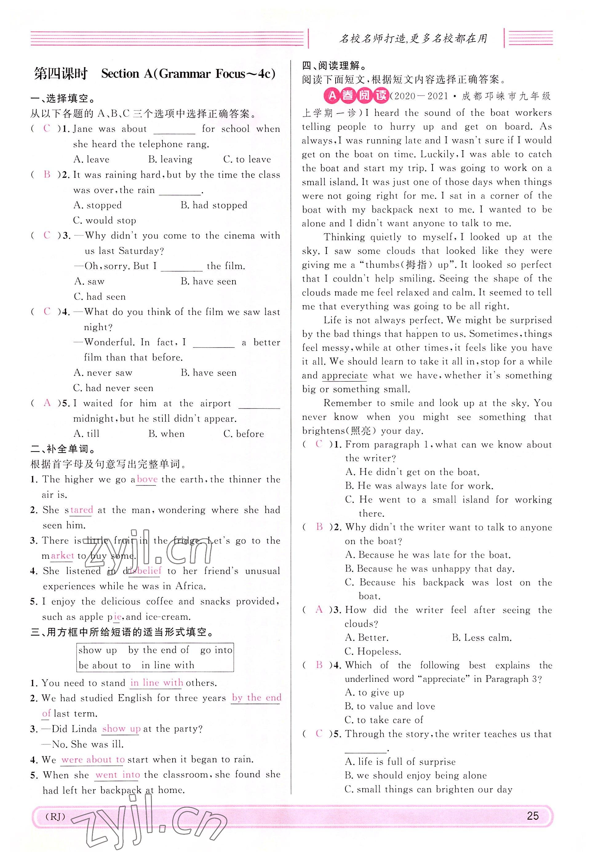 注:目前有些书本章节名称可能整理的还不是很完善,但都是按照顺序排列的,请同学们按照顺序仔细查找。练习册 2022年蓉城名校课堂九年级英语下册人教版 答案主要是用来给同学们做完题方便对答案用的,请勿直接抄袭。