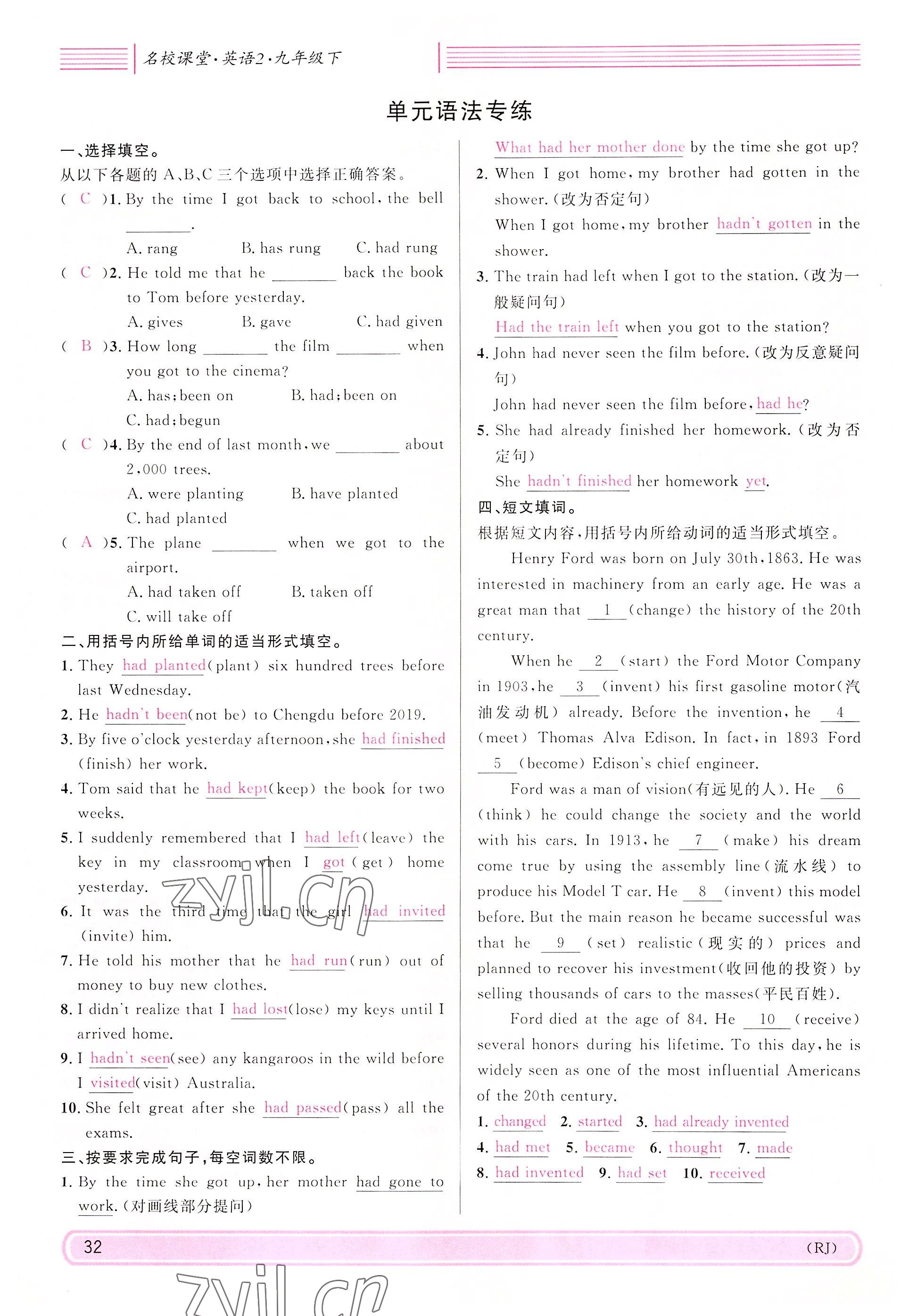 注:目前有些书本章节名称可能整理的还不是很完善,但都是按照顺序排列的,请同学们按照顺序仔细查找。练习册 2022年蓉城名校课堂九年级英语下册人教版 答案主要是用来给同学们做完题方便对答案用的,请勿直接抄袭。