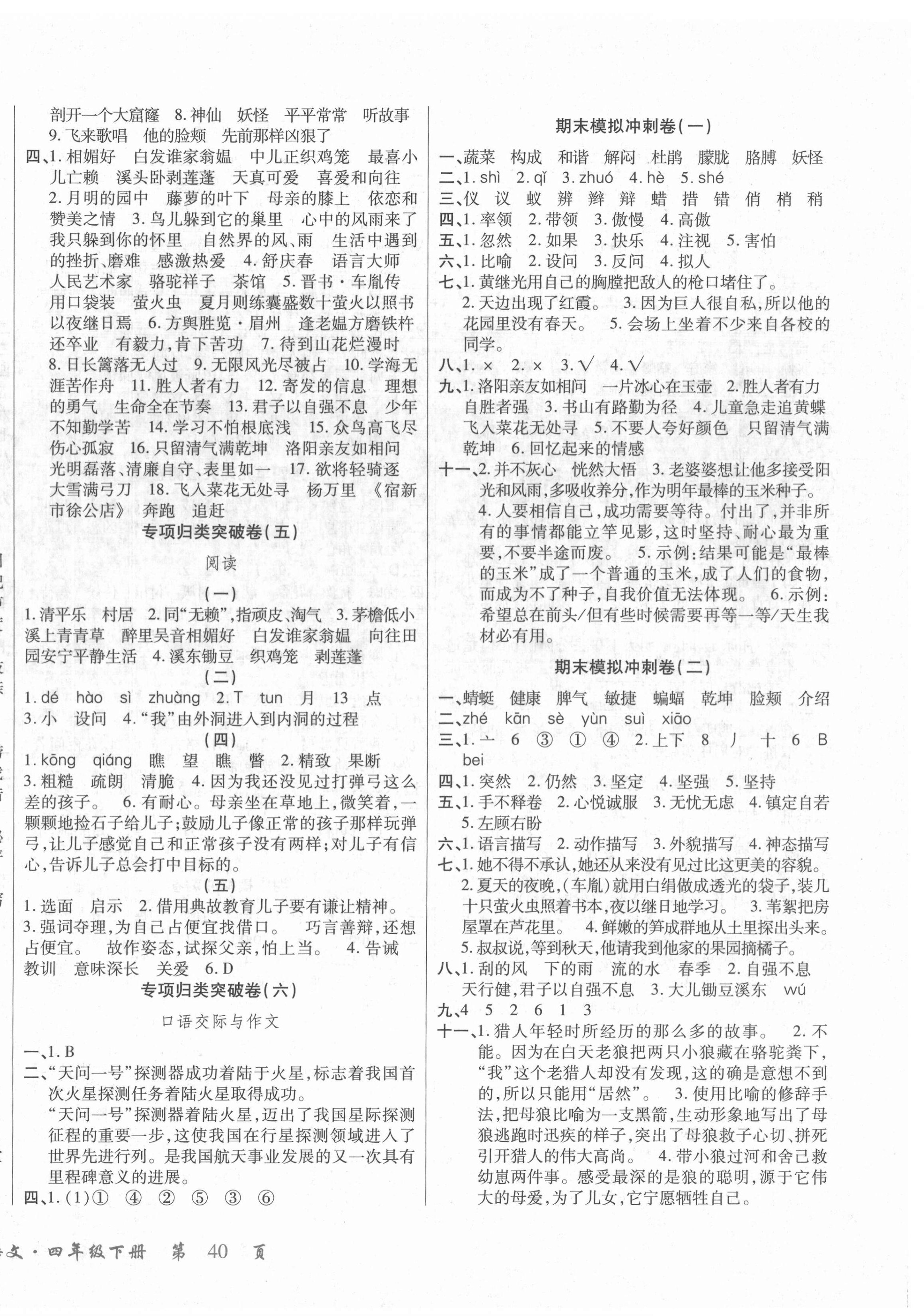 注:目前有些书本章节名称可能整理的还不是很完善,但都是按照顺序排列的,请同学们按照顺序仔细查找。练习册 2022年小学单元同步核心密卷四年级语文下册人教版 答案主要是用来给同学们做完题方便对答案用的,请勿直接抄袭。
