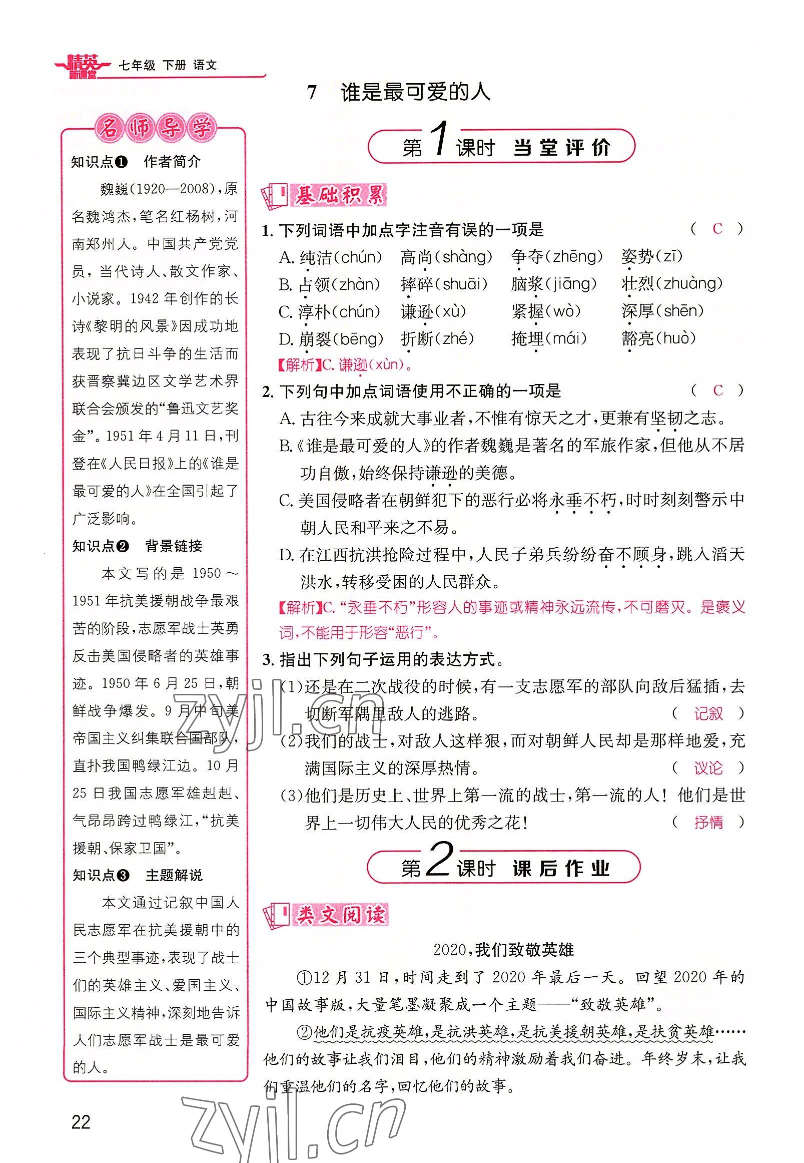 注:目前有些书本章节名称可能整理的还不是很完善,但都是按照顺序排列的,请同学们按照顺序仔细查找。练习册 2022年精英新课堂七年级语文下册人教版黄冈孝感咸宁专版 答案主要是用来给同学们做完题方便对答案用的,请勿直接抄袭。