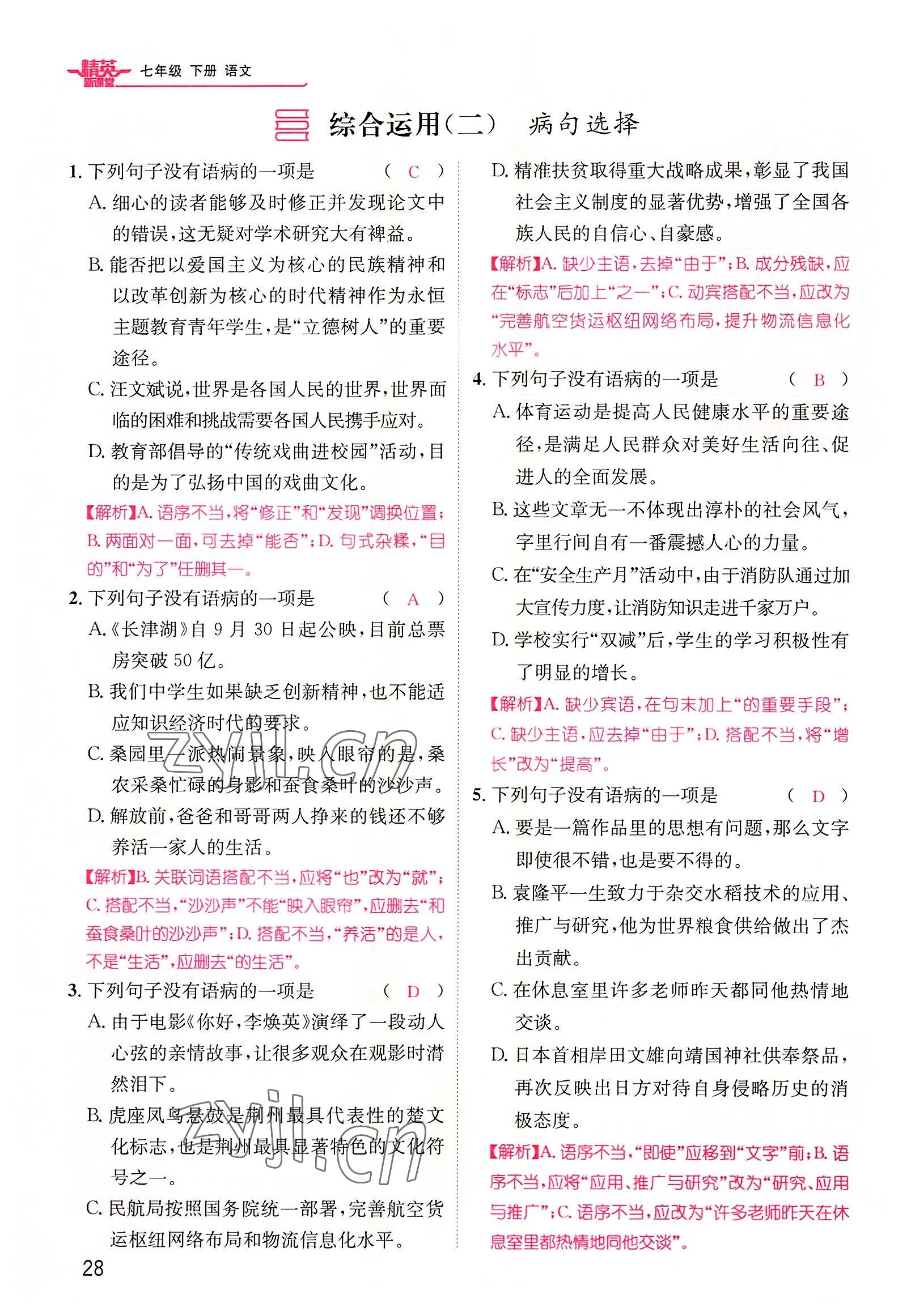 注:目前有些书本章节名称可能整理的还不是很完善,但都是按照顺序排列的,请同学们按照顺序仔细查找。练习册 2022年精英新课堂七年级语文下册人教版黄冈孝感咸宁专版 答案主要是用来给同学们做完题方便对答案用的,请勿直接抄袭。