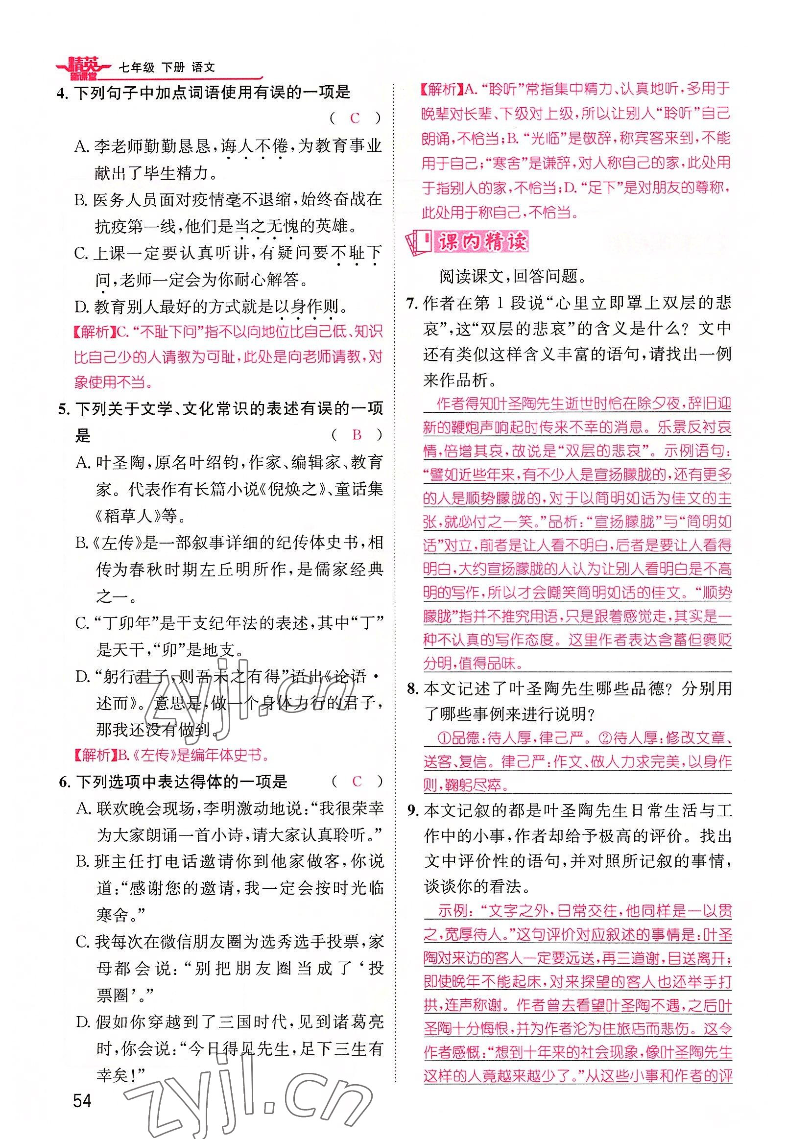 注:目前有些书本章节名称可能整理的还不是很完善,但都是按照顺序排列的,请同学们按照顺序仔细查找。练习册 2022年精英新课堂七年级语文下册人教版黄冈孝感咸宁专版 答案主要是用来给同学们做完题方便对答案用的,请勿直接抄袭。