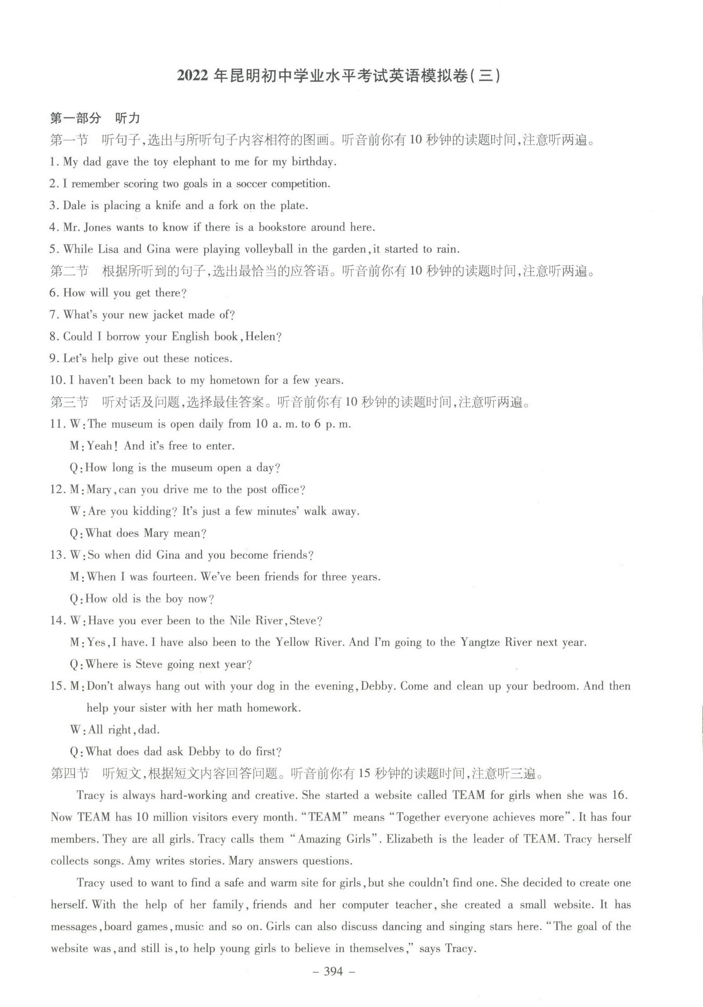 2022年云南省初中学业水平考试导与练英语昆明专版