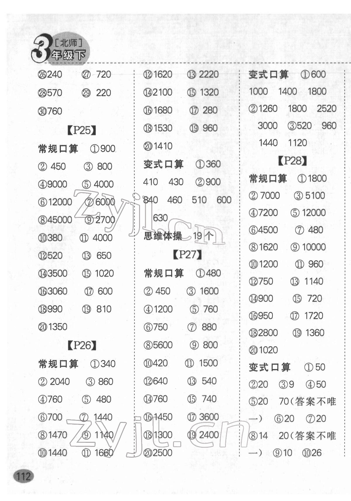 2022年同步口算题卡三年级数学下册北师大版深圳专版
