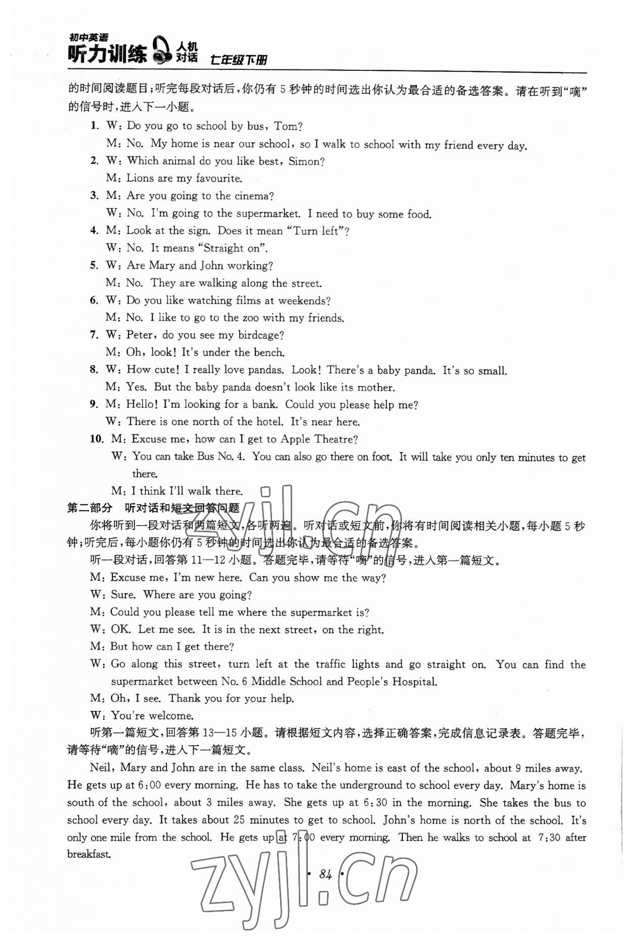 2022年初中英语听力训练人机对话七年级下册译林版