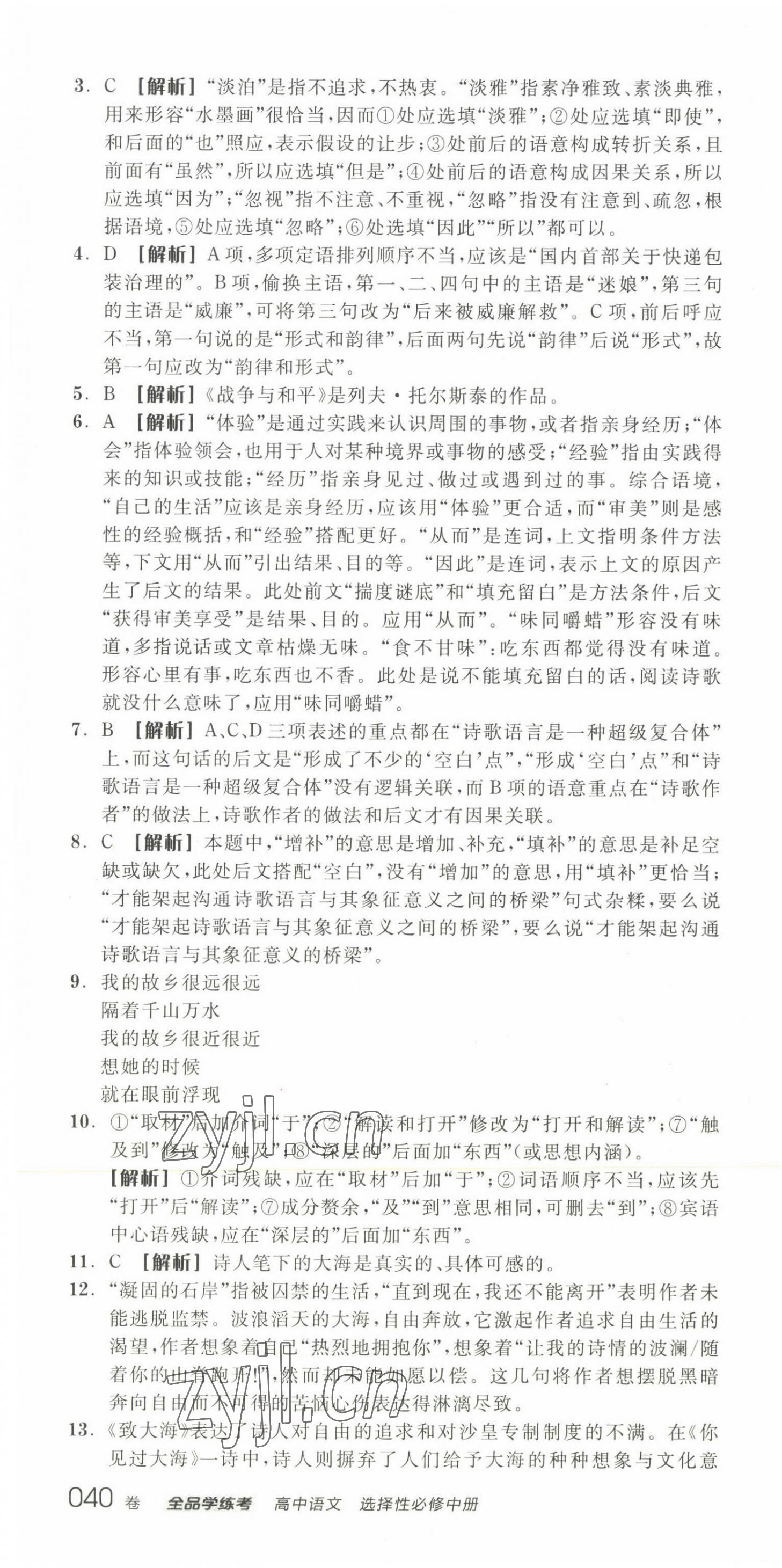 注:目前有些书本章节名称可能整理的还不是很完善,但都是按照顺序排列的,请同学们按照顺序仔细查找。练习册 2022年全品学练考高中语文4选择性必修中册 答案主要是用来给同学们做完题方便对答案用的,请勿直接抄袭。