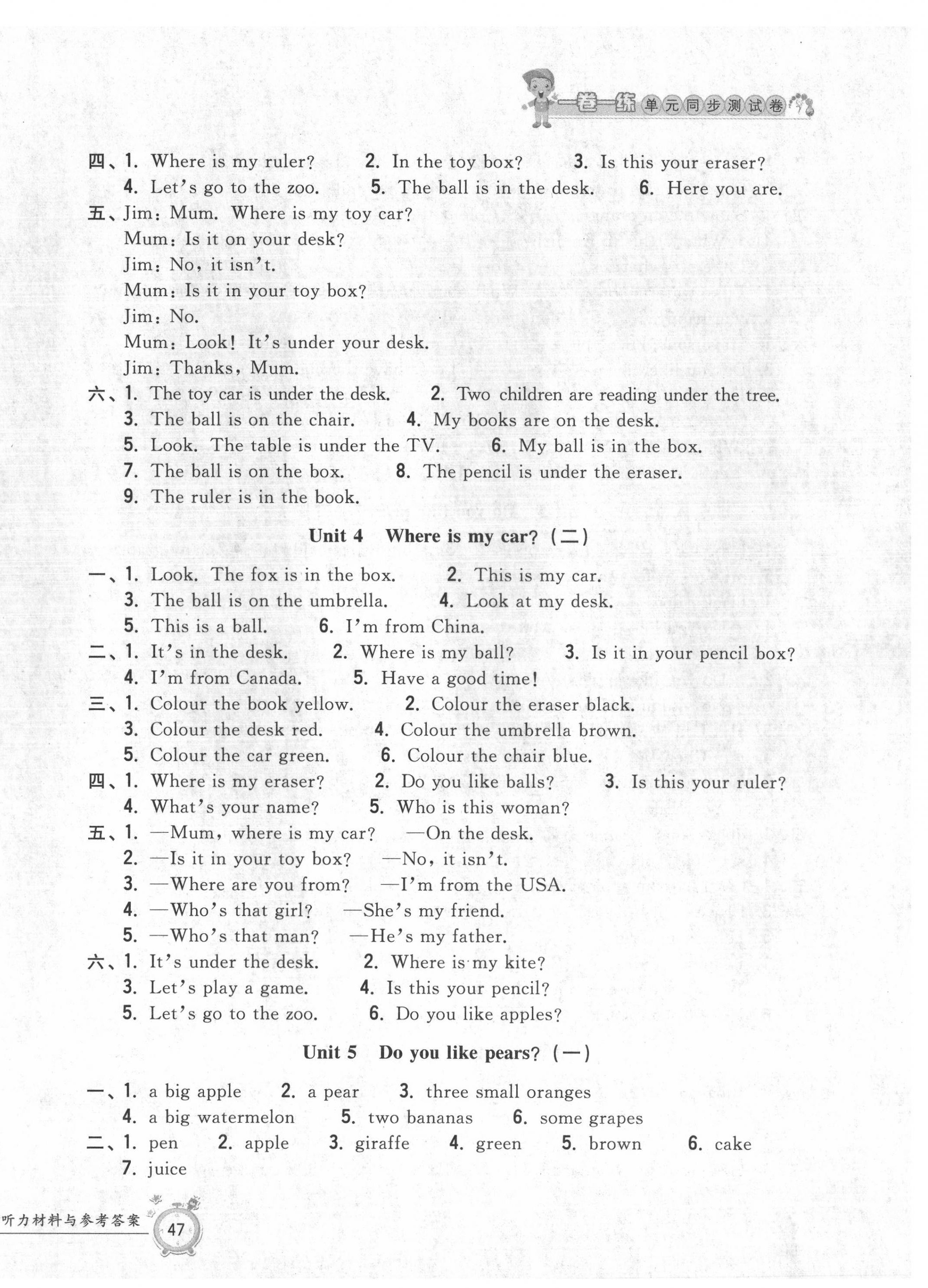 注:目前有些书本章节名称可能整理的还不是很完善,但都是按照顺序排列的,请同学们按照顺序仔细查找。练习册 2022年一卷一练单元同步测试卷三年级英语下册人教PEP版 答案主要是用来给同学们做完题方便对答案用的,请勿直接抄袭。
