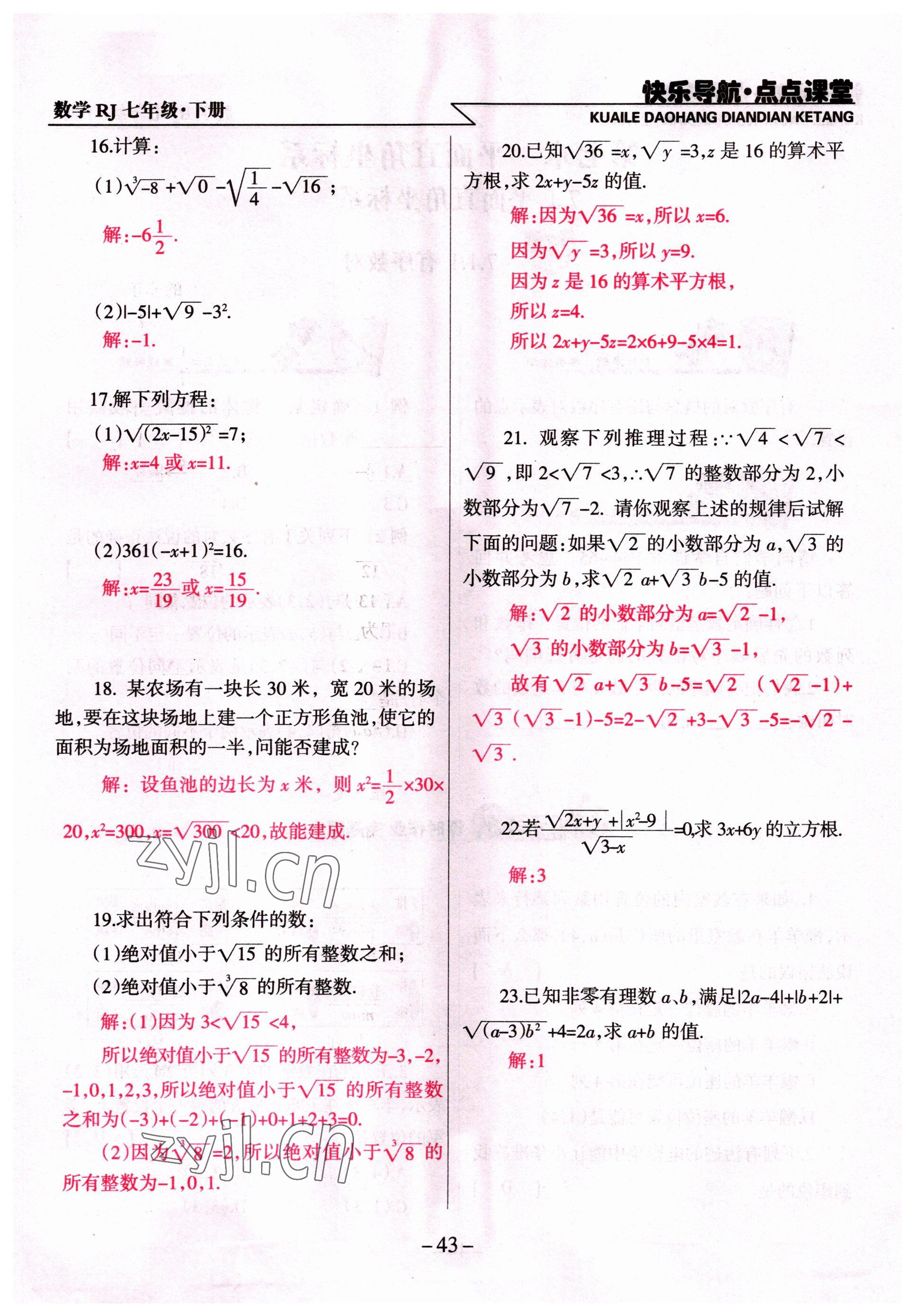 注:目前有些书本章节名称可能整理的还不是很完善,但都是按照顺序排列的,请同学们按照顺序仔细查找。练习册 2022年快乐导航点点课堂七年级数学下册人教版 答案主要是用来给同学们做完题方便对答案用的,请勿直接抄袭。