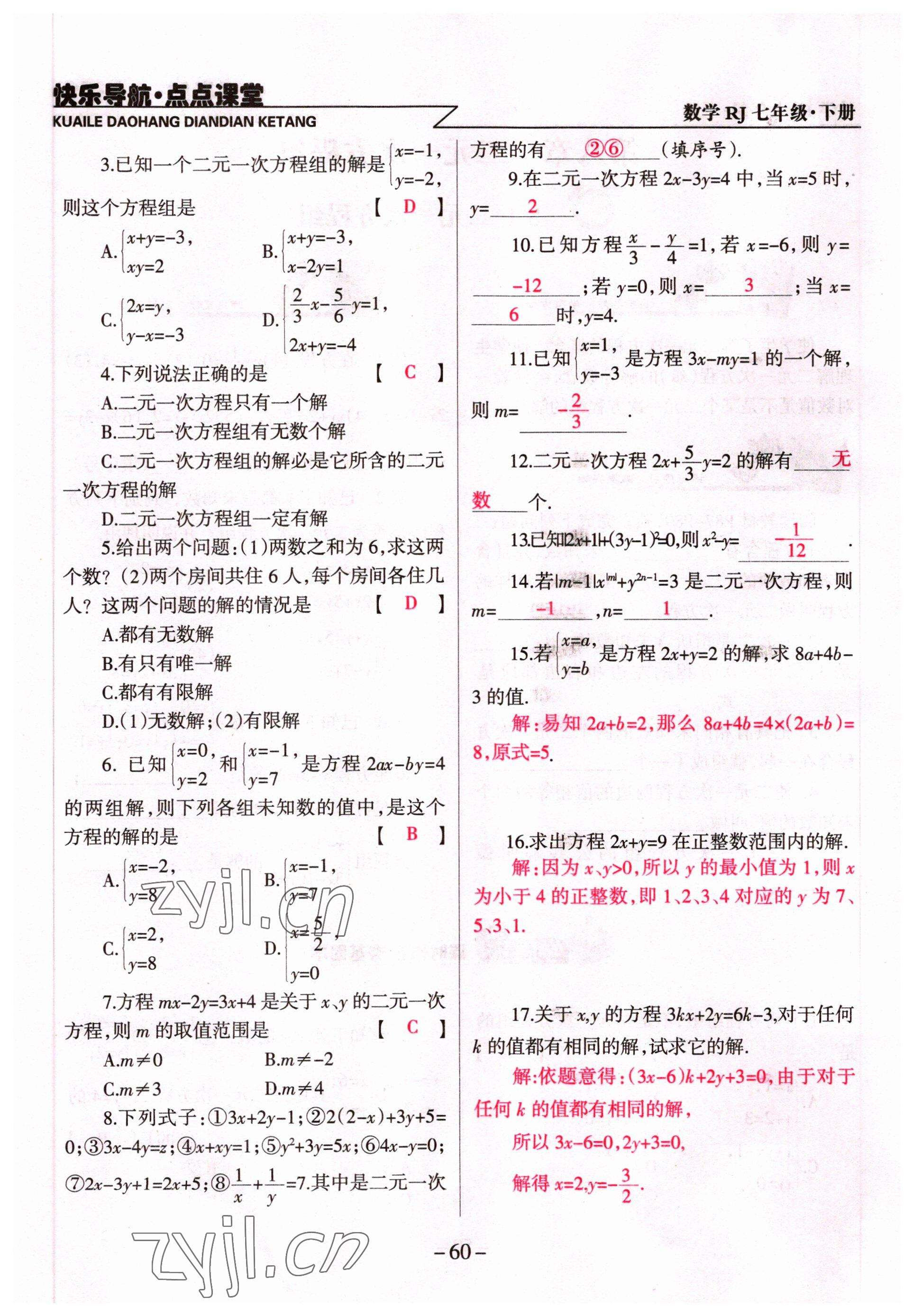 注:目前有些书本章节名称可能整理的还不是很完善,但都是按照顺序排列的,请同学们按照顺序仔细查找。练习册 2022年快乐导航点点课堂七年级数学下册人教版 答案主要是用来给同学们做完题方便对答案用的,请勿直接抄袭。