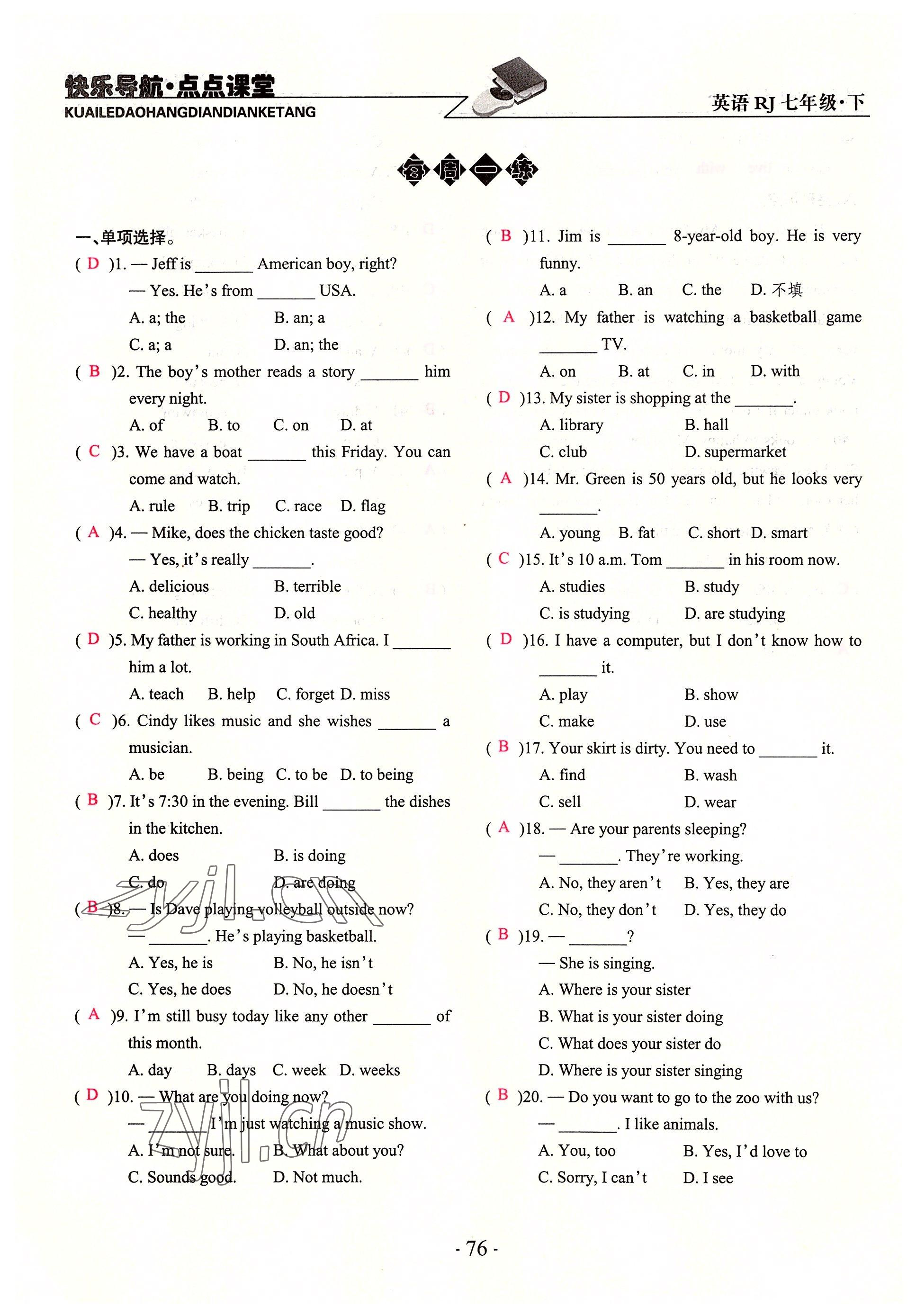 注:目前有些书本章节名称可能整理的还不是很完善,但都是按照顺序排列的,请同学们按照顺序仔细查找。练习册 2022年快乐导航点点课堂七年级英语下册人教版 答案主要是用来给同学们做完题方便对答案用的,请勿直接抄袭。