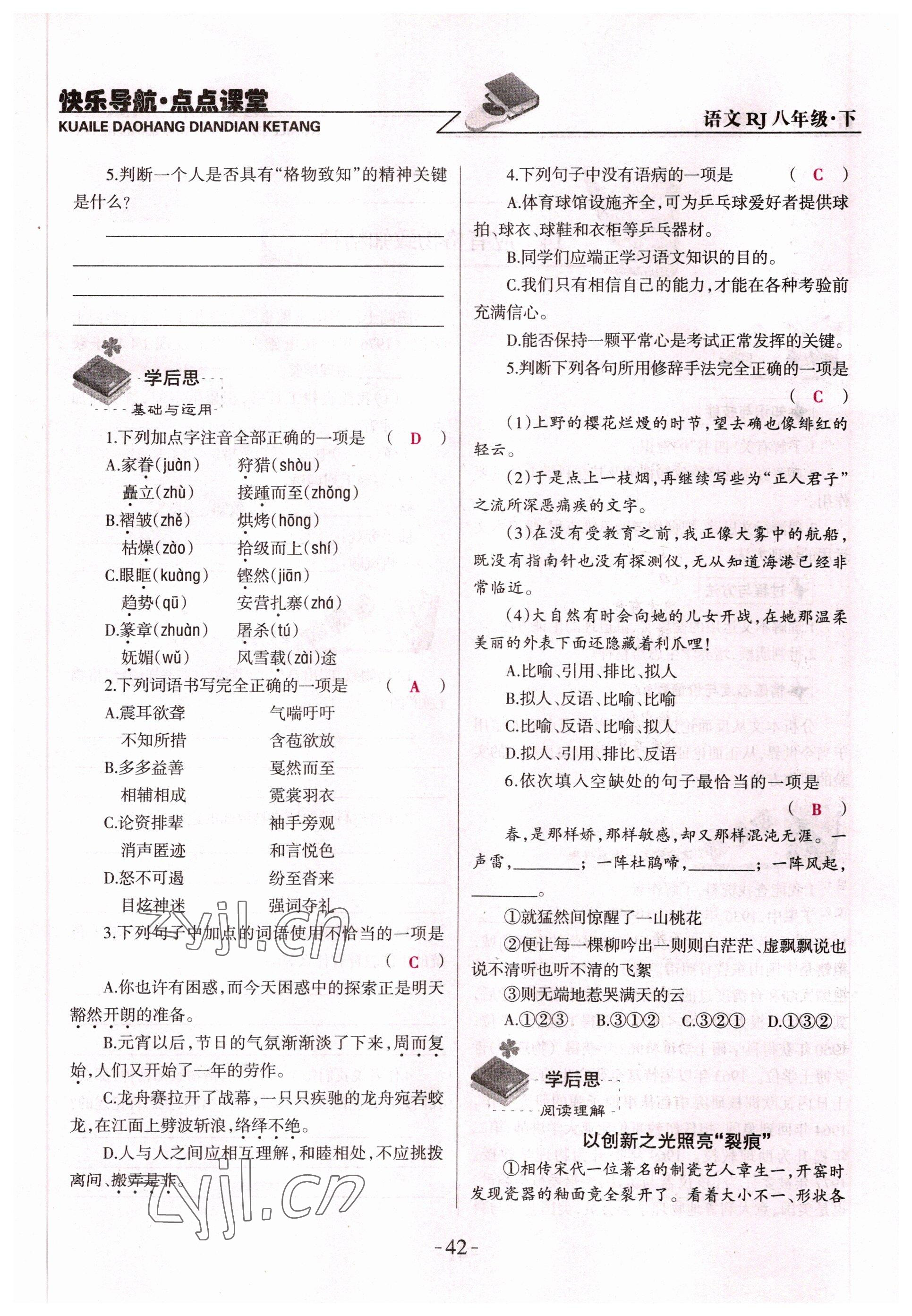 注:目前有些书本章节名称可能整理的还不是很完善,但都是按照顺序排列的,请同学们按照顺序仔细查找。练习册 2022年快乐导航点点课堂八年级语文下册人教版 答案主要是用来给同学们做完题方便对答案用的,请勿直接抄袭。