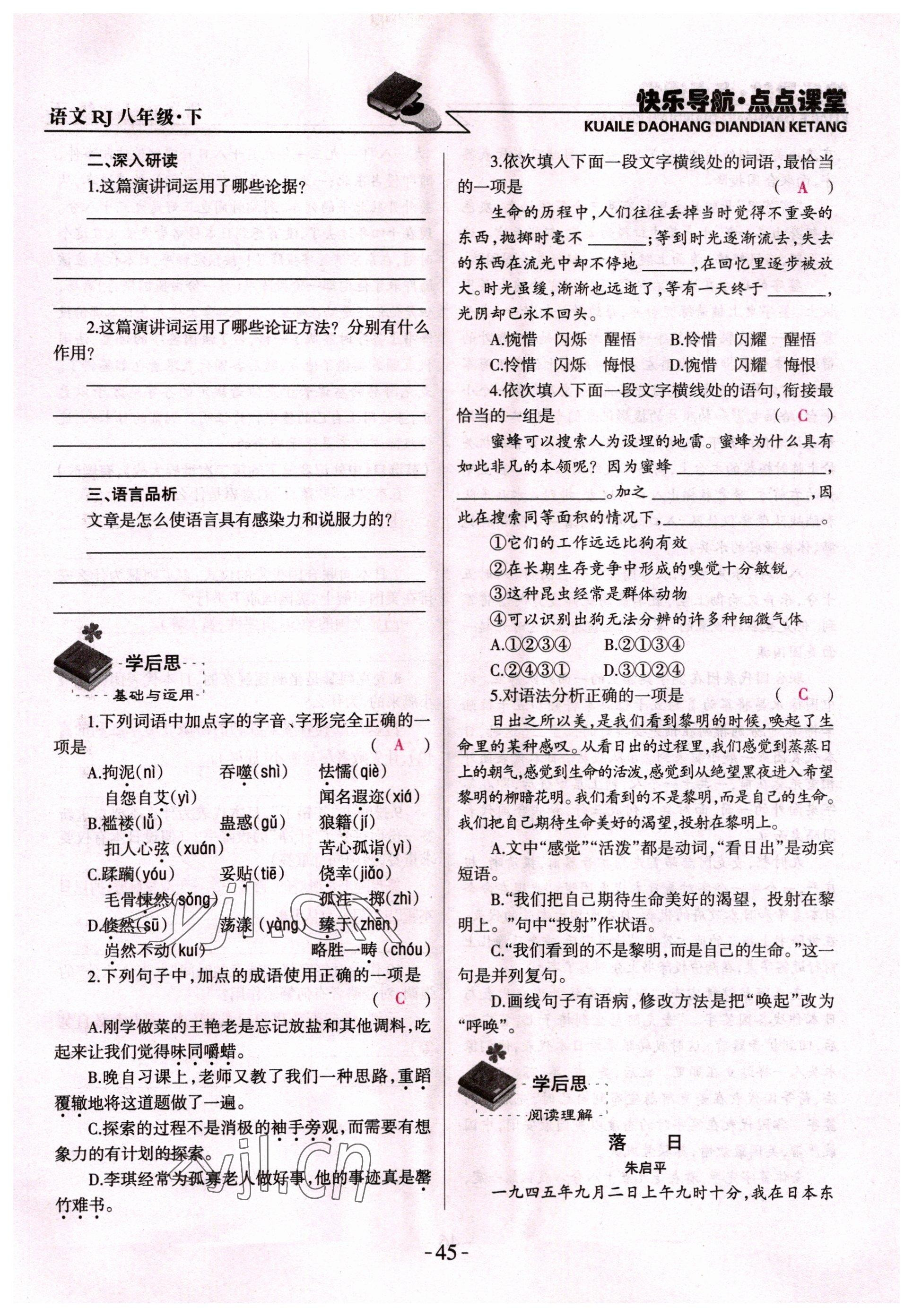 注:目前有些书本章节名称可能整理的还不是很完善,但都是按照顺序排列的,请同学们按照顺序仔细查找。练习册 2022年快乐导航点点课堂八年级语文下册人教版 答案主要是用来给同学们做完题方便对答案用的,请勿直接抄袭。