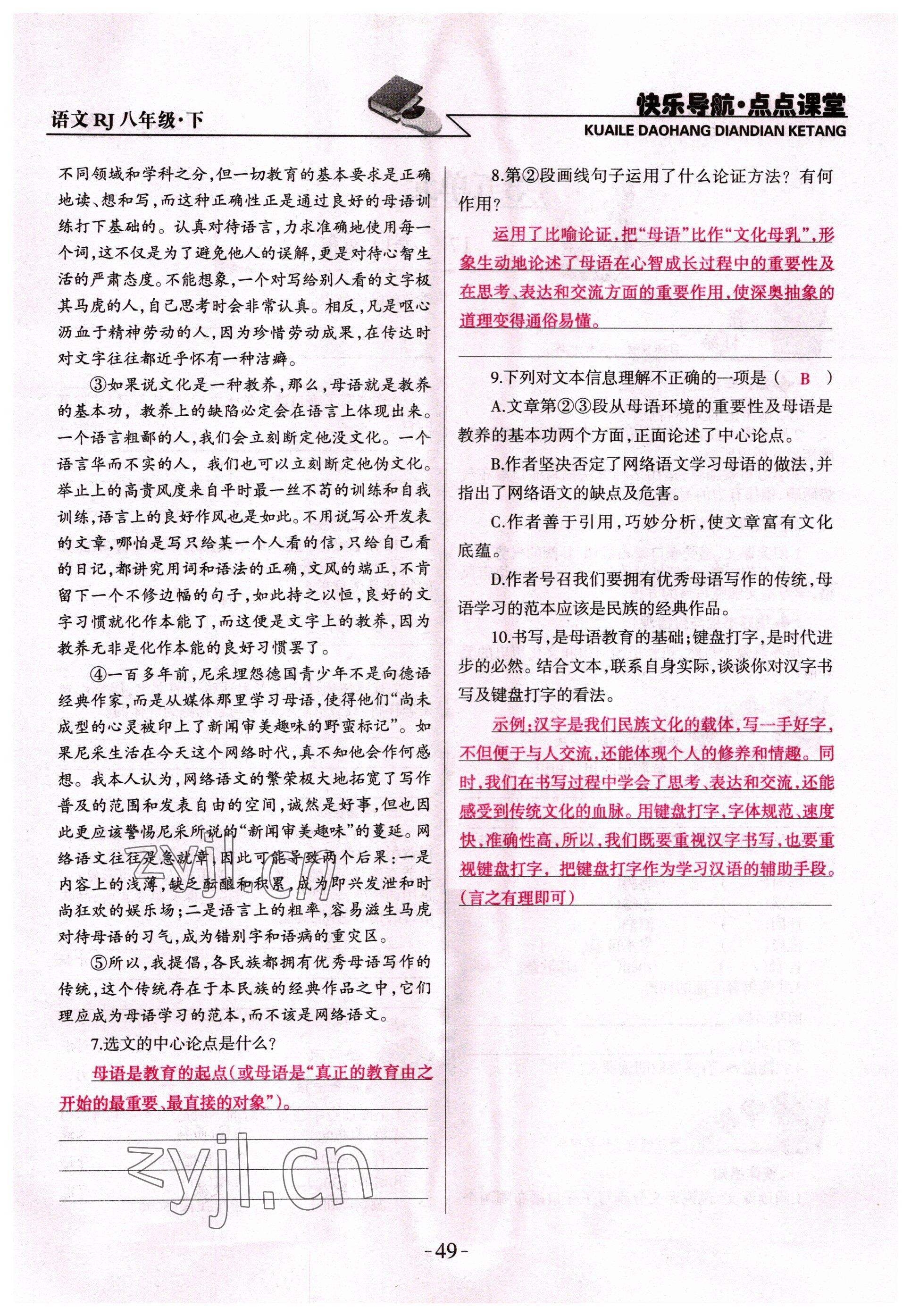 注:目前有些书本章节名称可能整理的还不是很完善,但都是按照顺序排列的,请同学们按照顺序仔细查找。练习册 2022年快乐导航点点课堂八年级语文下册人教版 答案主要是用来给同学们做完题方便对答案用的,请勿直接抄袭。