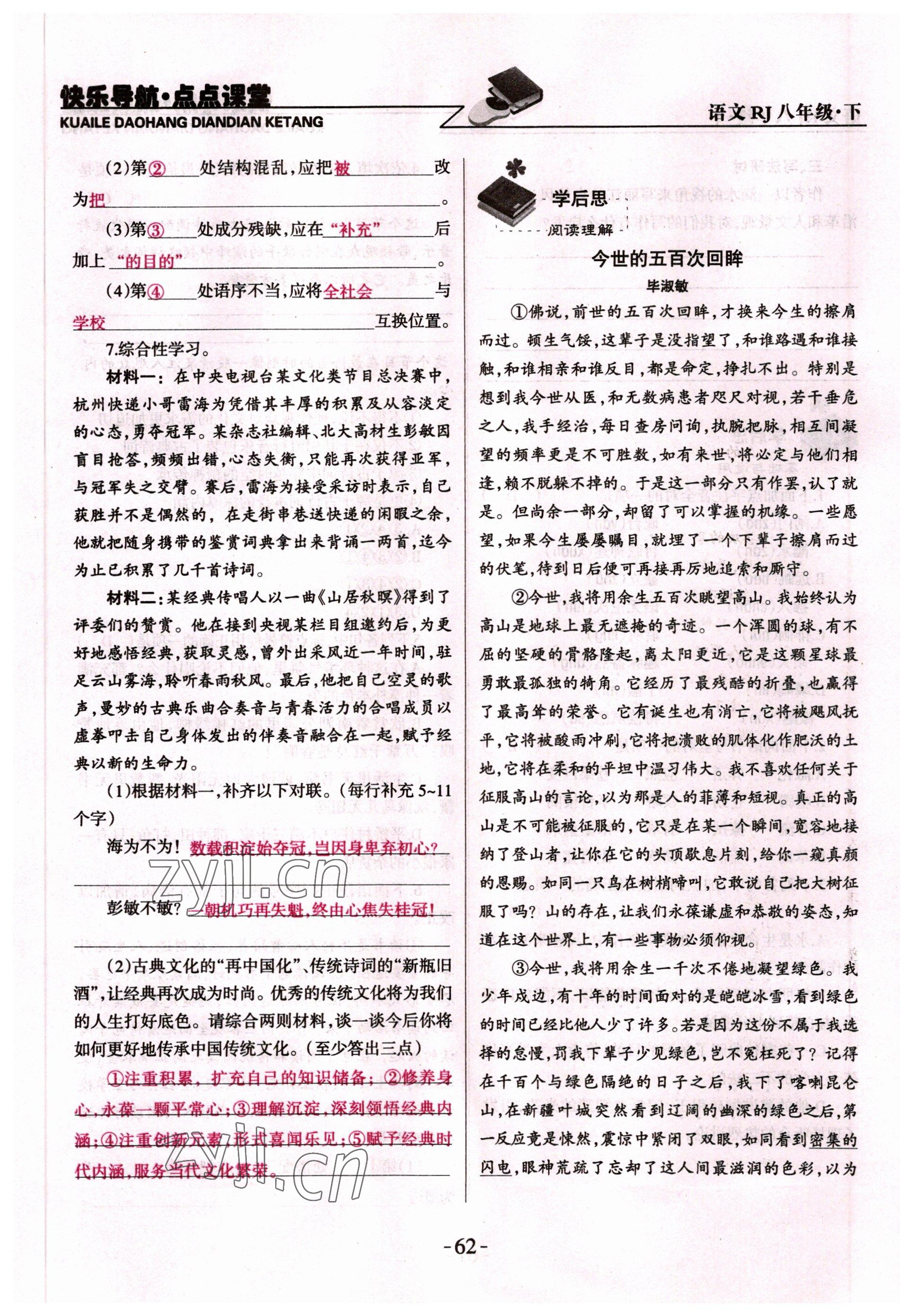 注:目前有些书本章节名称可能整理的还不是很完善,但都是按照顺序排列的,请同学们按照顺序仔细查找。练习册 2022年快乐导航点点课堂八年级语文下册人教版 答案主要是用来给同学们做完题方便对答案用的,请勿直接抄袭。