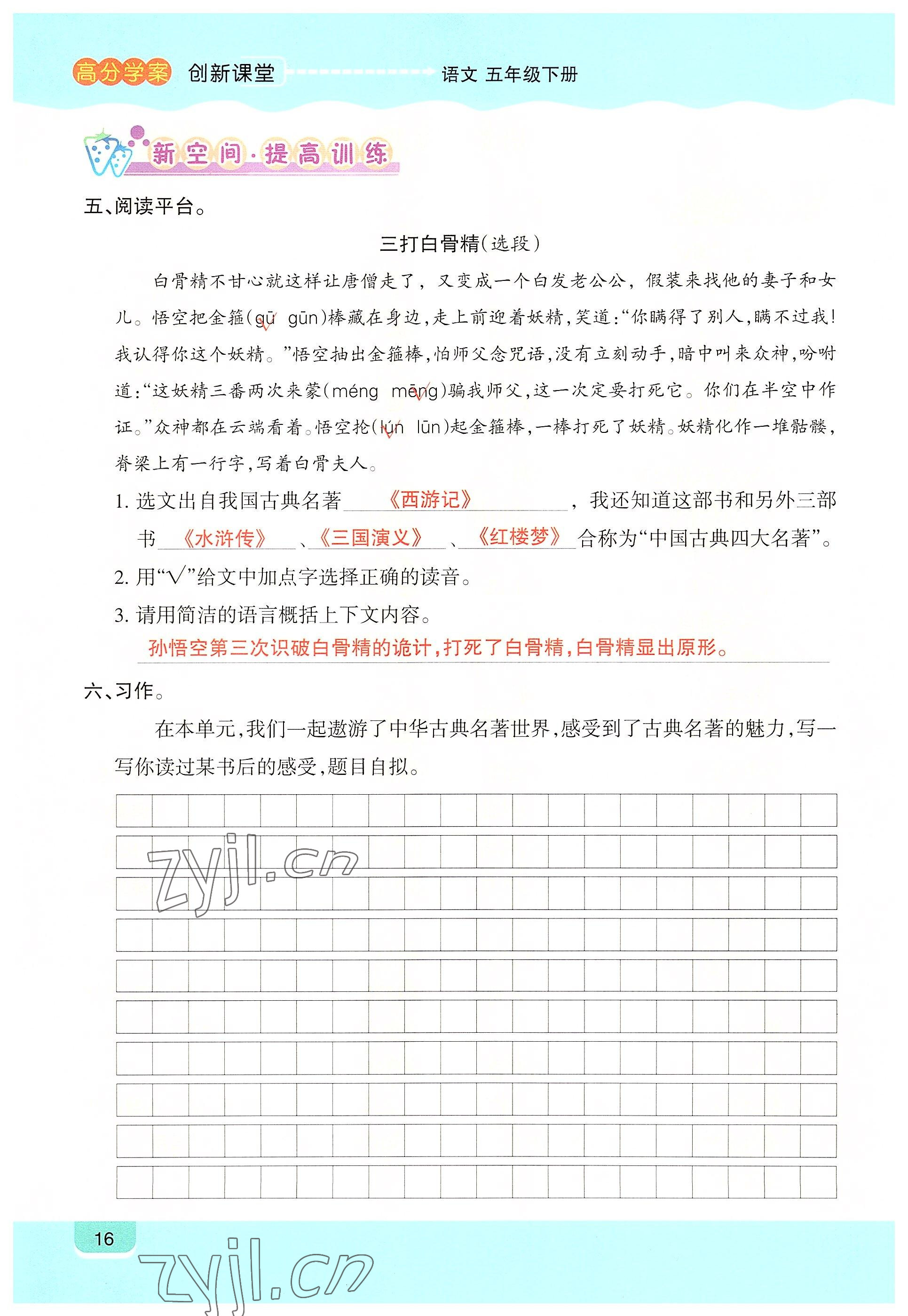注:目前有些书本章节名称可能整理的还不是很完善,但都是按照顺序排列的,请同学们按照顺序仔细查找。练习册 2022年高分学案创新课堂五年级语文下册人教版 答案主要是用来给同学们做完题方便对答案用的,请勿直接抄袭。