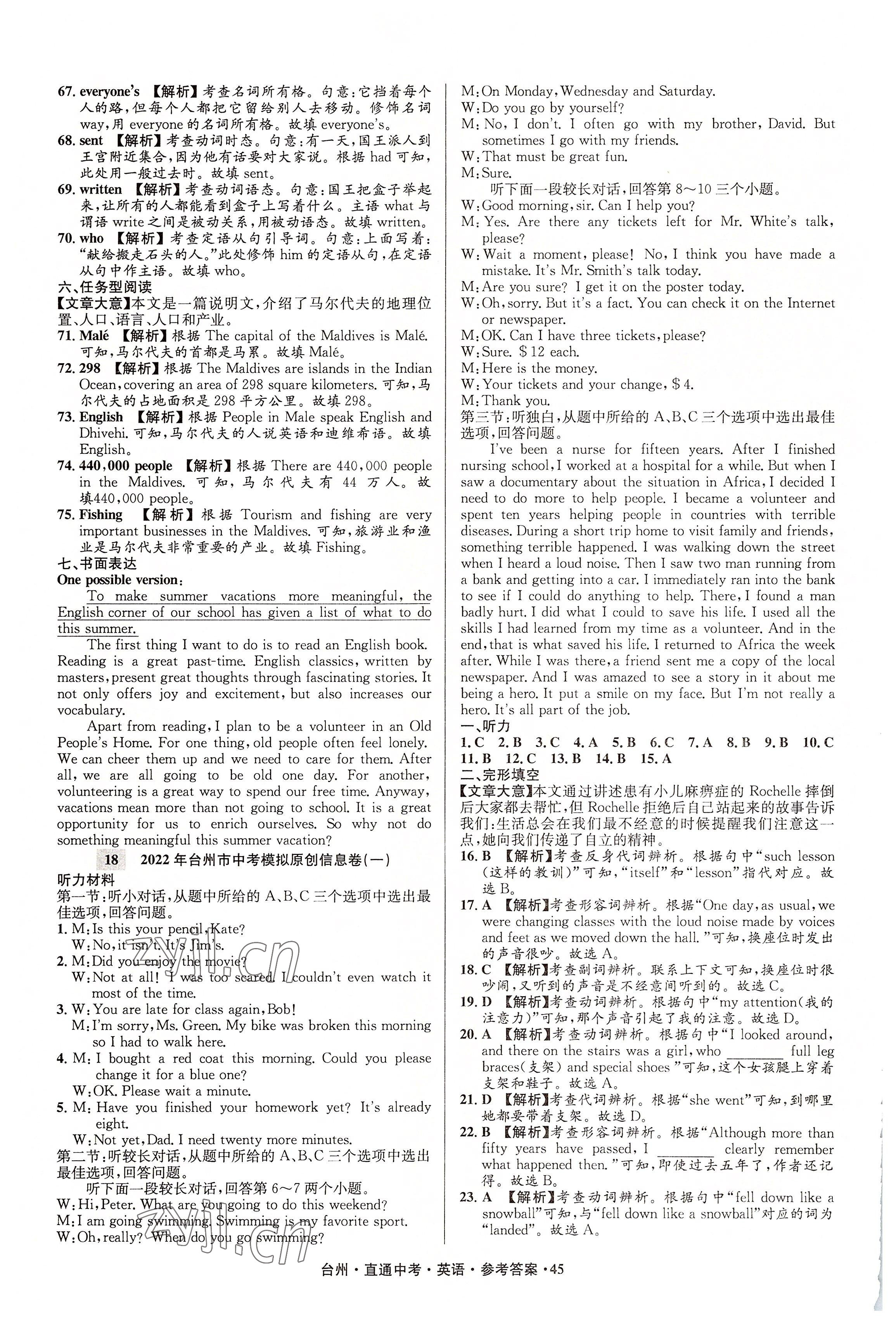 注:目前有些书本章节名称可能整理的还不是很完善,但都是按照顺序排列的,请同学们按照顺序仔细查找。练习册 2022年直通中考中考试题精编英语台州专版 答案主要是用来给同学们做完题方便对答案用的,请勿直接抄袭。