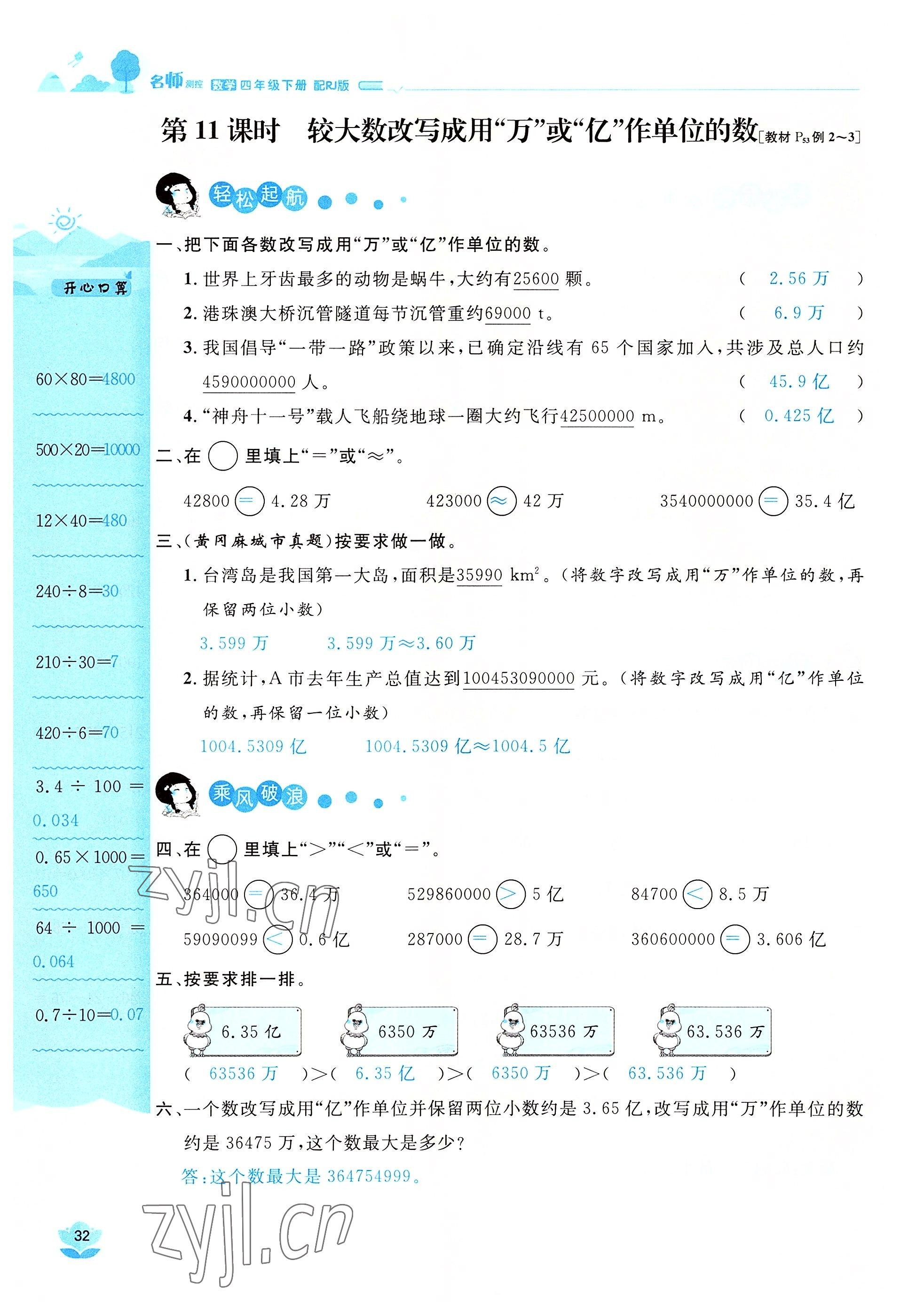 2022年名师测控四年级数学下册人教版鄂黄专版