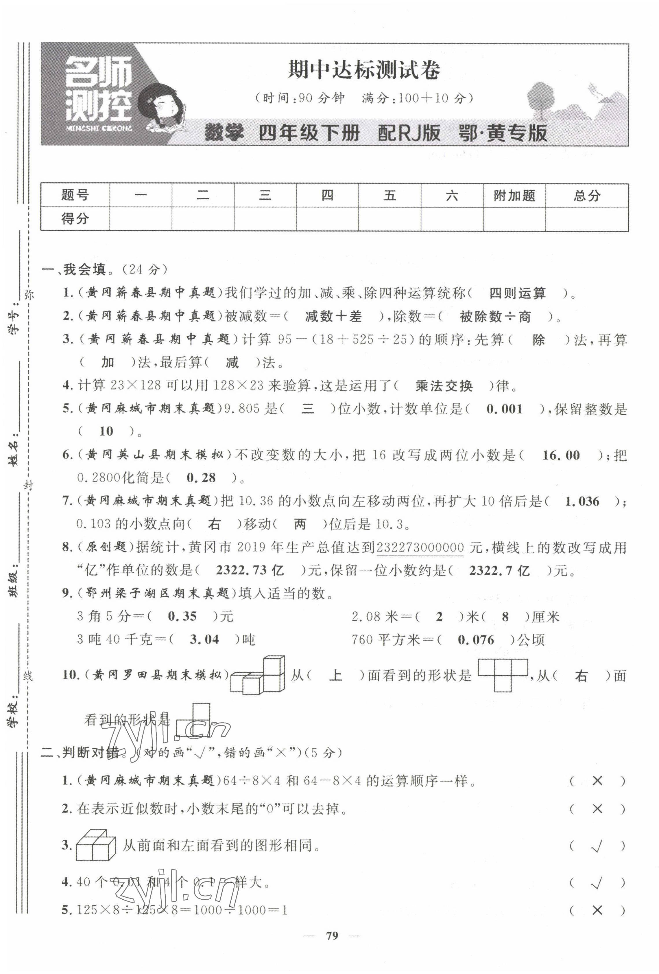 2022年名师测控四年级数学下册人教版鄂黄专版