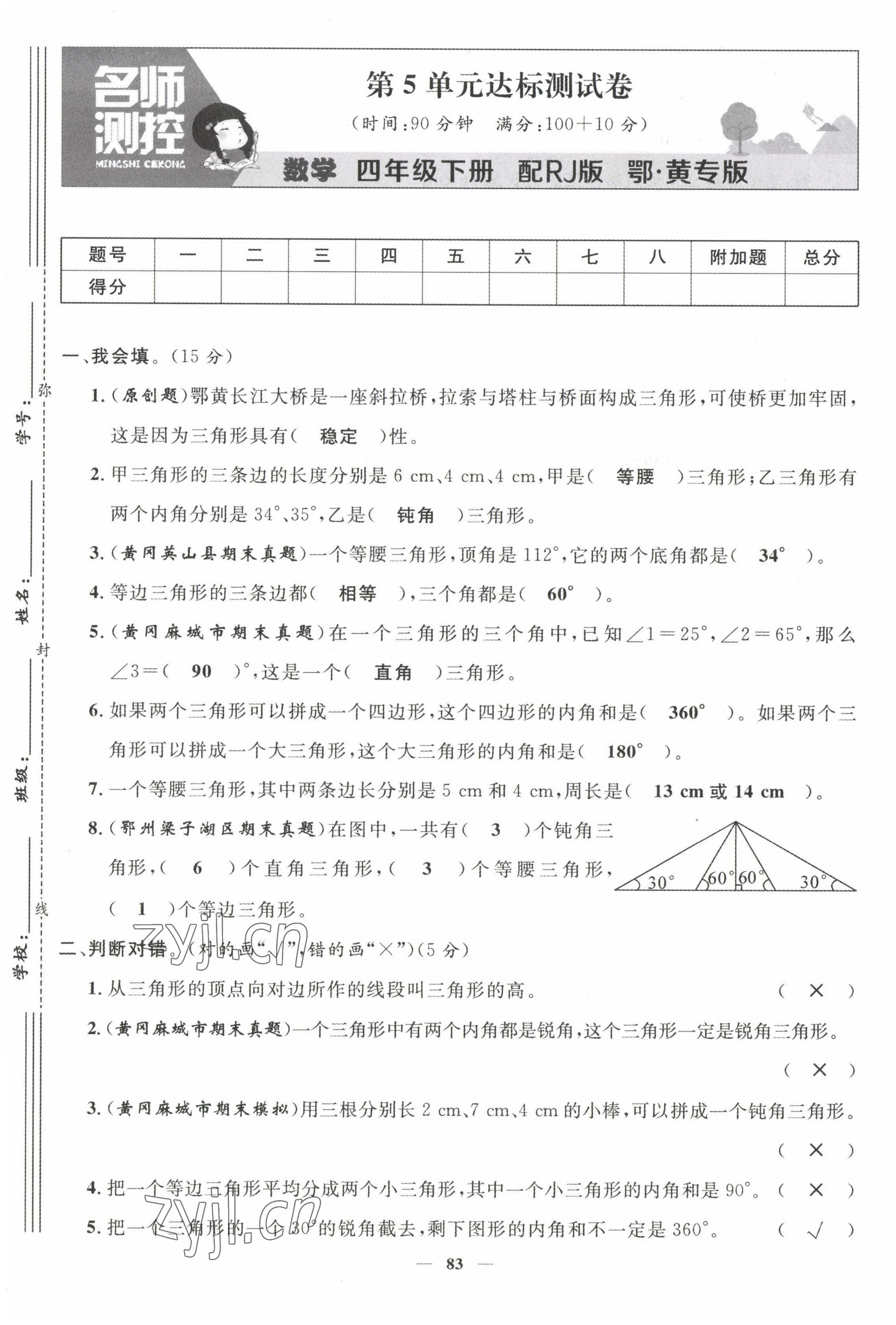 注:目前有些书本章节名称可能整理的还不是很完善,但都是按照顺序排列的,请同学们按照顺序仔细查找。练习册 2022年名师测控四年级数学下册人教版鄂黄专版 答案主要是用来给同学们做完题方便对答案用的,请勿直接抄袭。