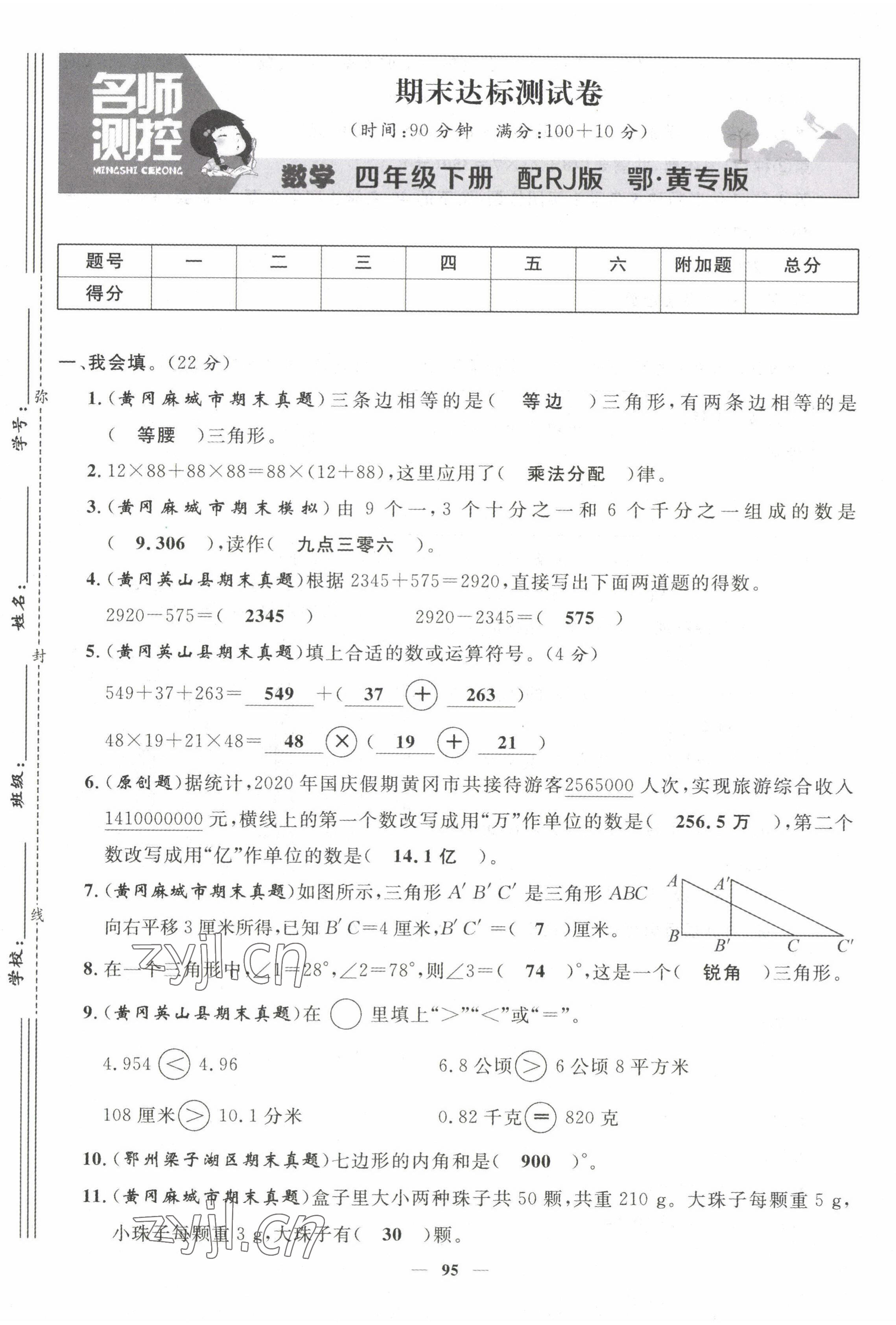 2022年名师测控四年级数学下册人教版鄂黄专版