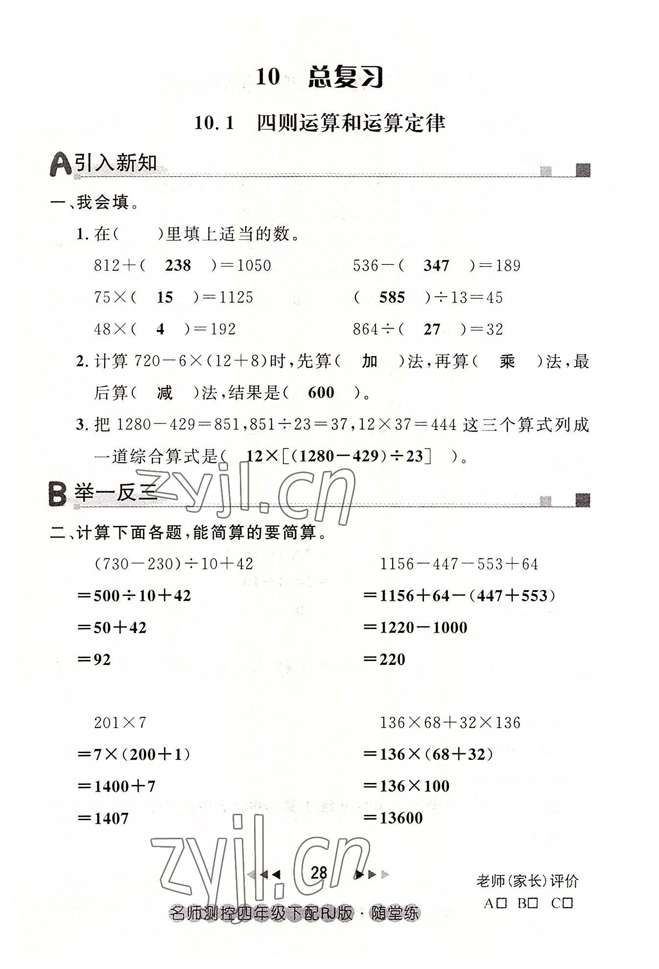 《2022年名师测控四年级数学下册人教版鄂黄专版》