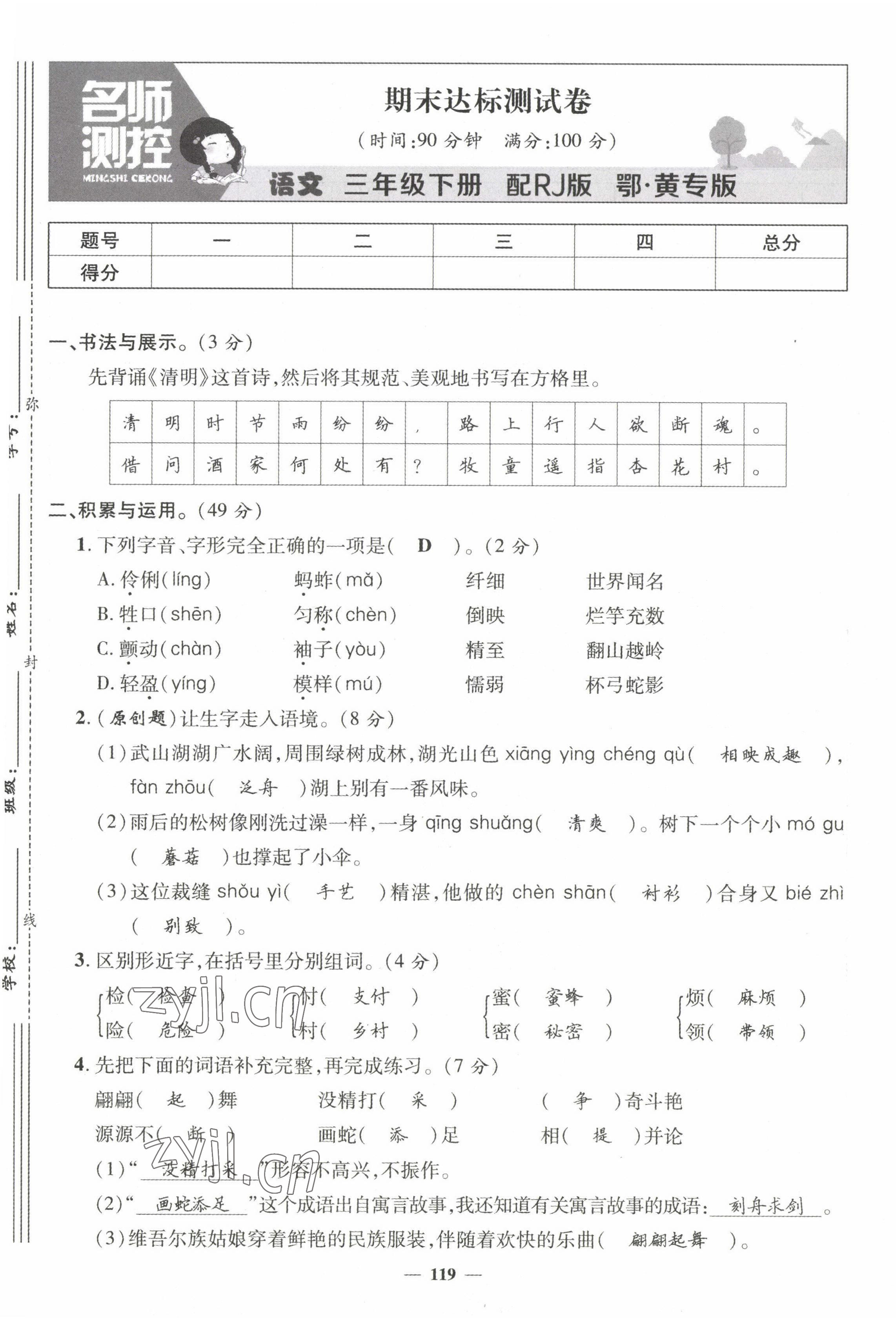 2022年名师测控三年级语文下册人教版鄂黄专版