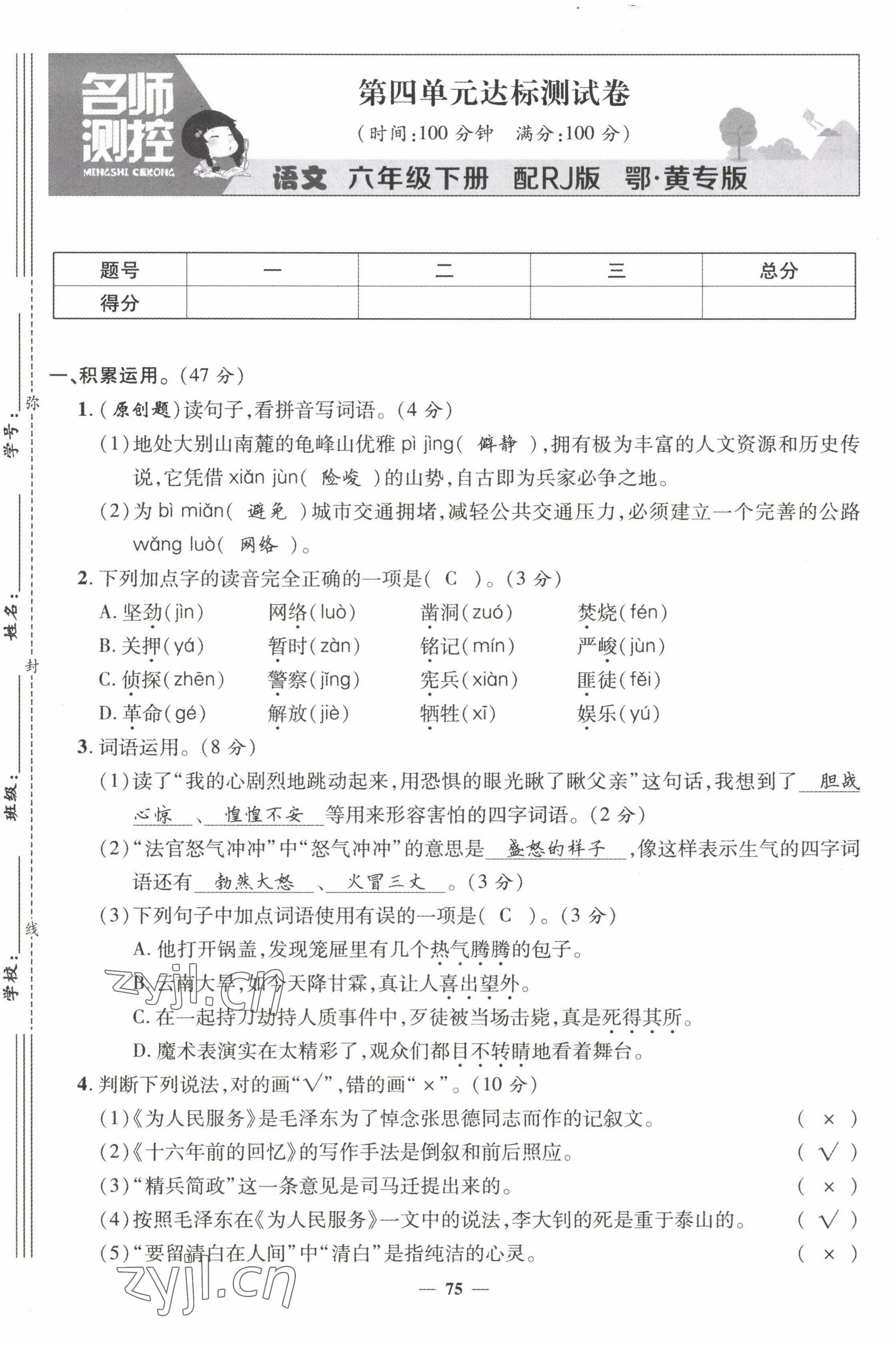 2022年名师测控六年级语文下册人教版鄂黄专版