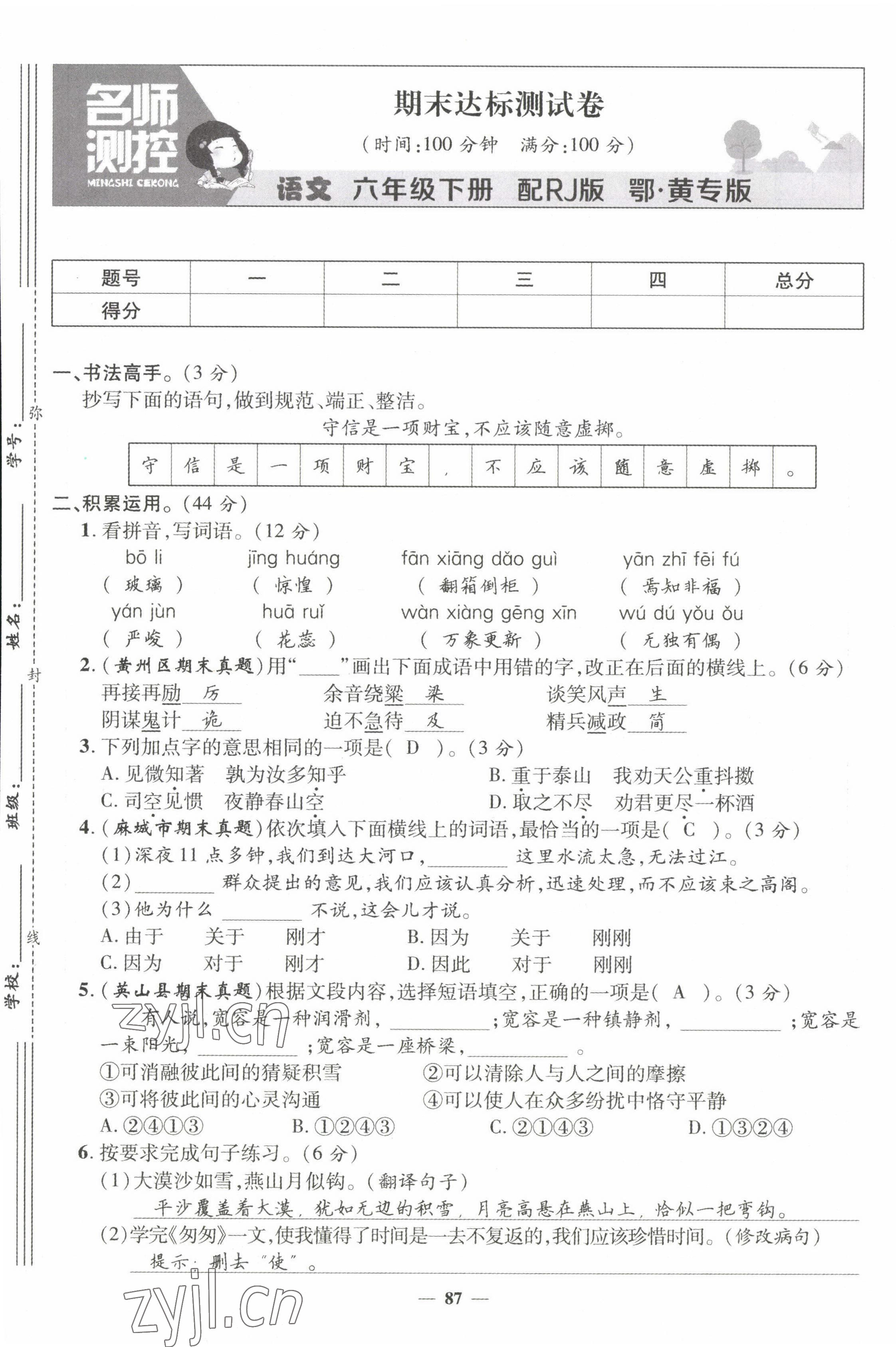 2022年名师测控六年级语文下册人教版鄂黄专版