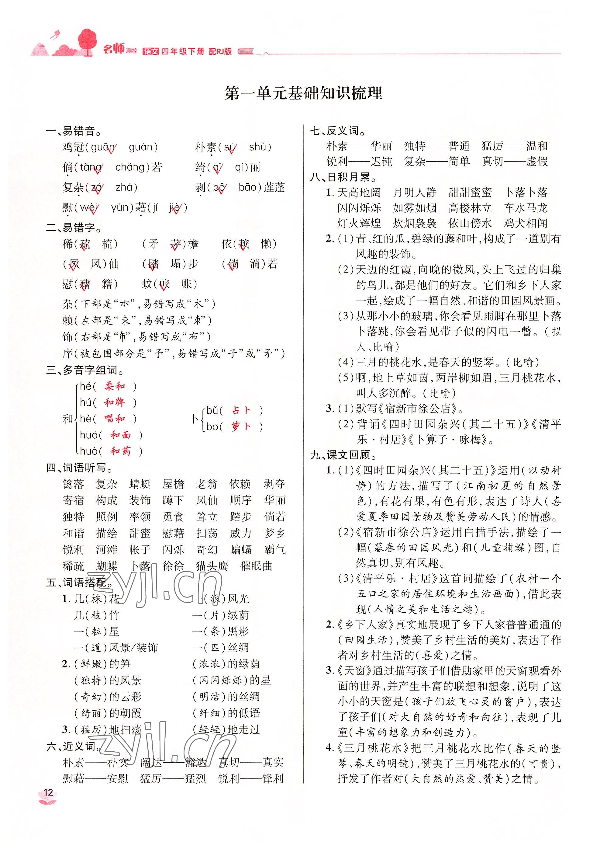 注:目前有些书本章节名称可能整理的还不是很完善,但都是按照顺序排列的,请同学们按照顺序仔细查找。练习册 2022年名师测控四年级语文下册人教版鄂黄专版 答案主要是用来给同学们做完题方便对答案用的,请勿直接抄袭。