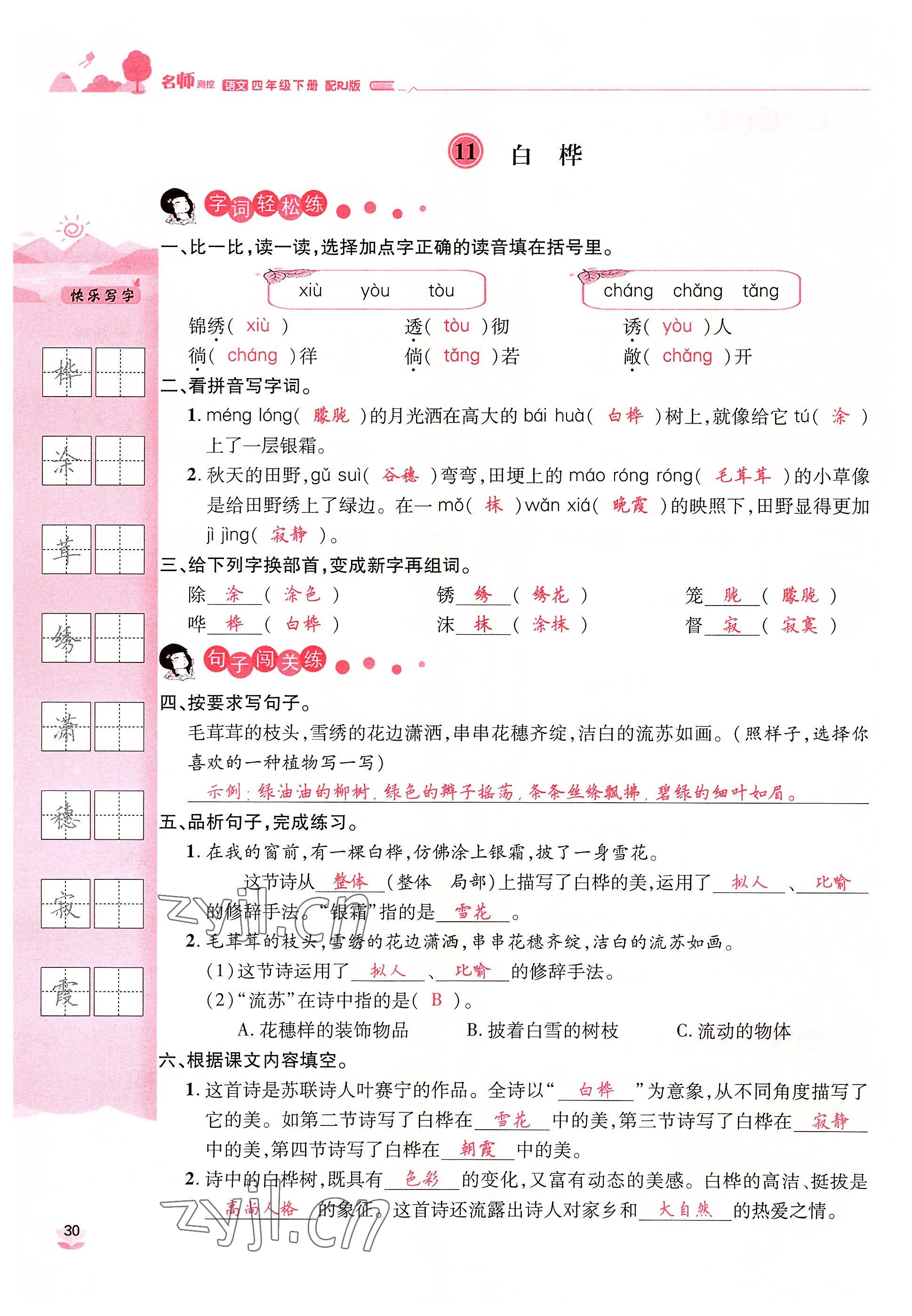 2022年名师测控四年级语文下册人教版鄂黄专版