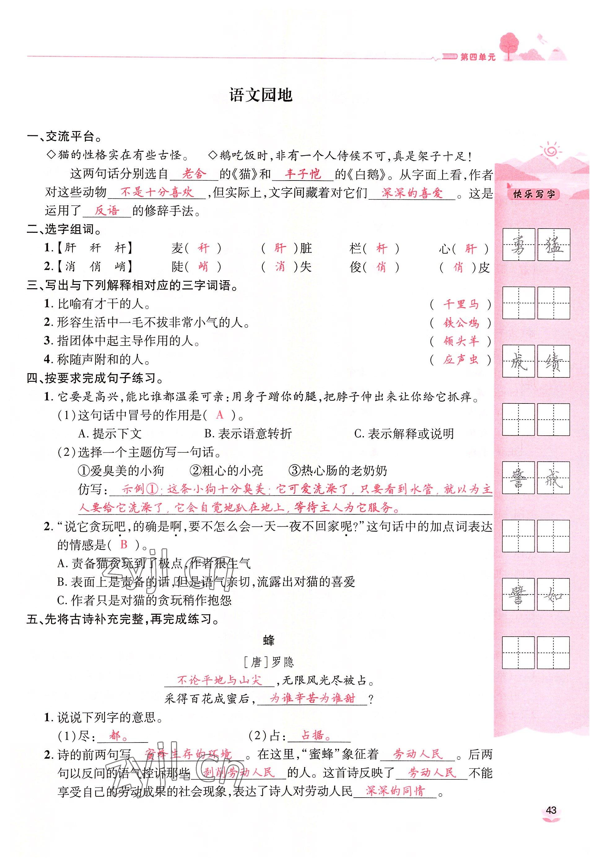 注:目前有些书本章节名称可能整理的还不是很完善,但都是按照顺序排列的,请同学们按照顺序仔细查找。练习册 2022年名师测控四年级语文下册人教版鄂黄专版 答案主要是用来给同学们做完题方便对答案用的,请勿直接抄袭。