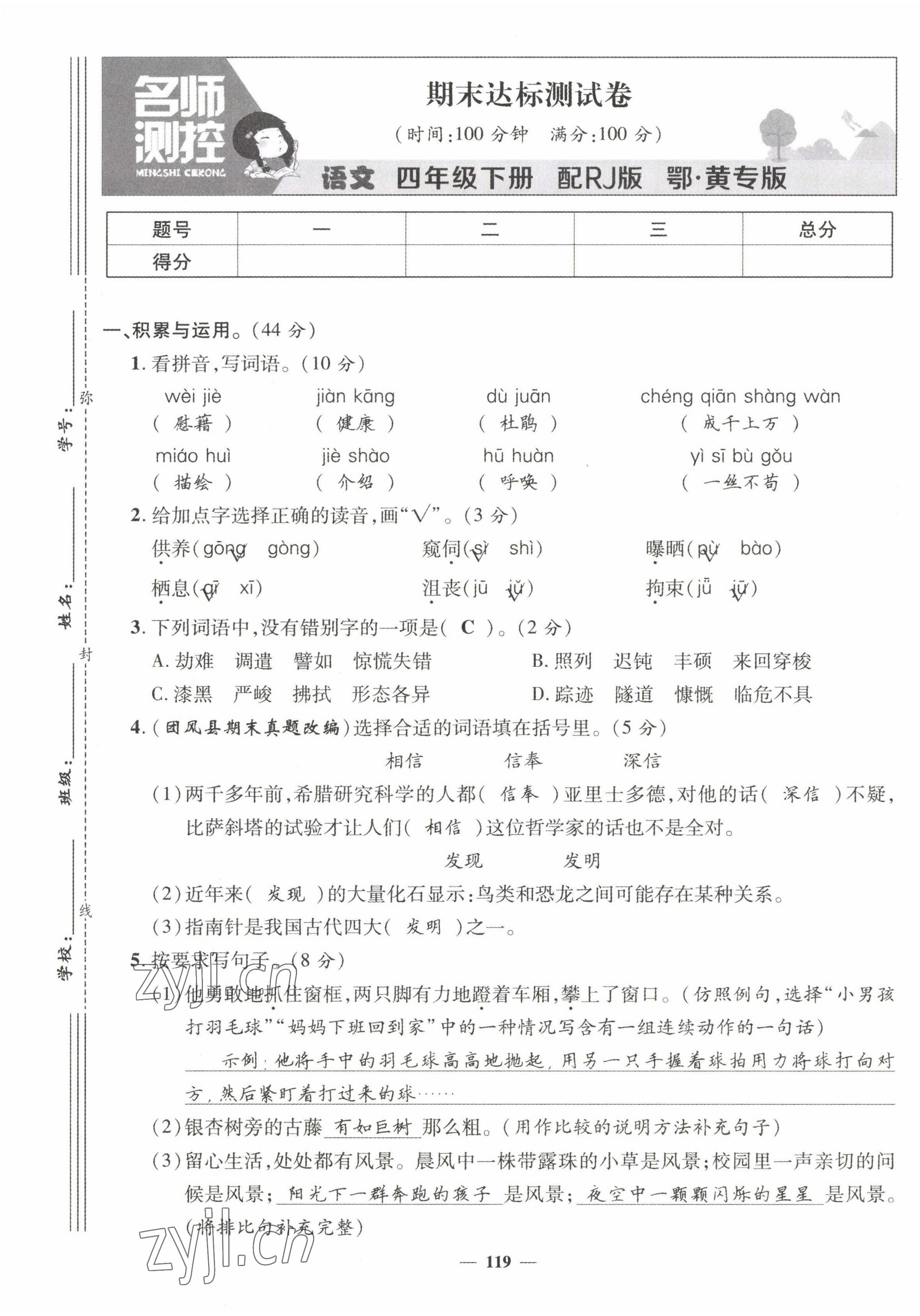 2022年名师测控四年级语文下册人教版鄂黄专版