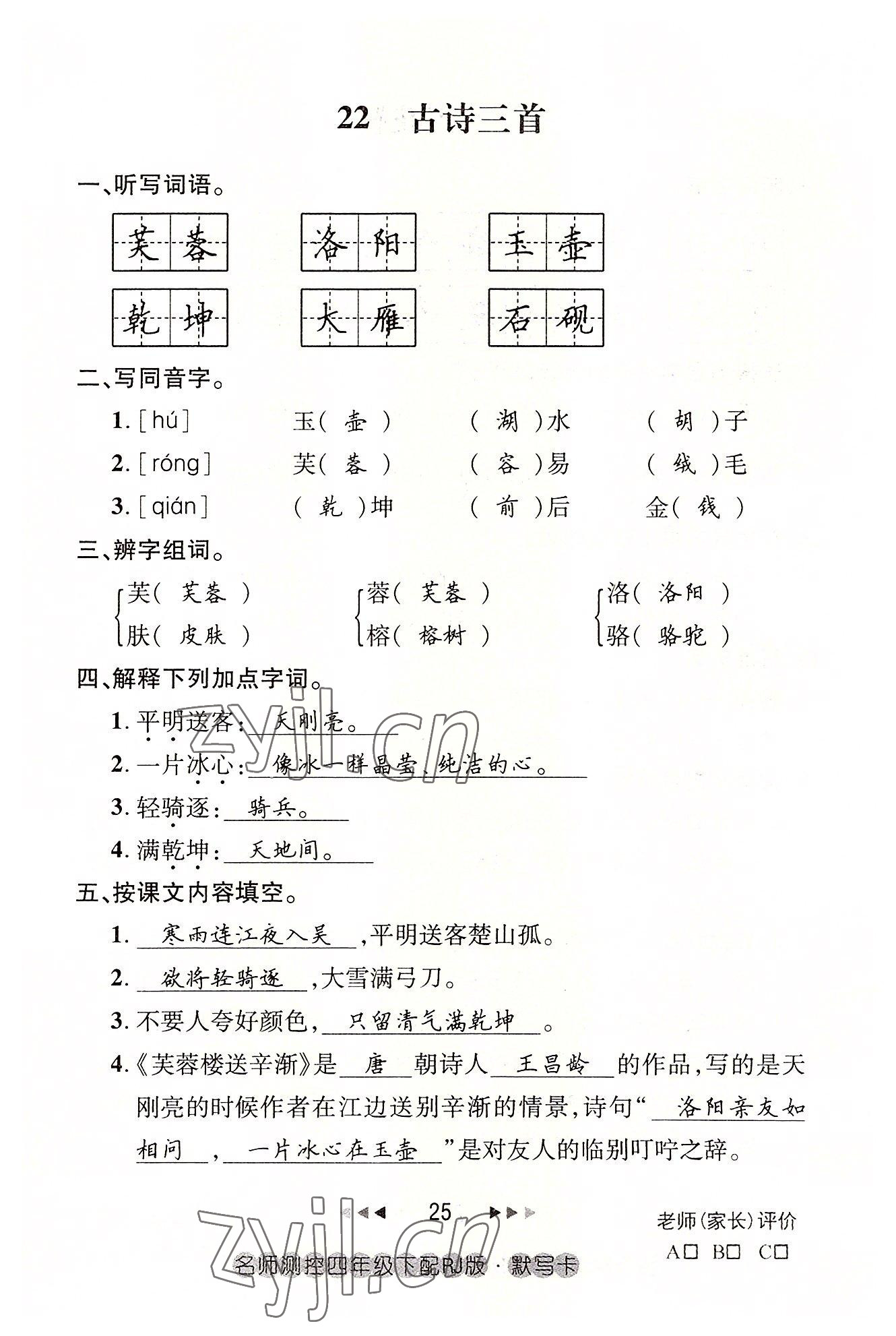 2022年名师测控四年级语文下册人教版鄂黄专版