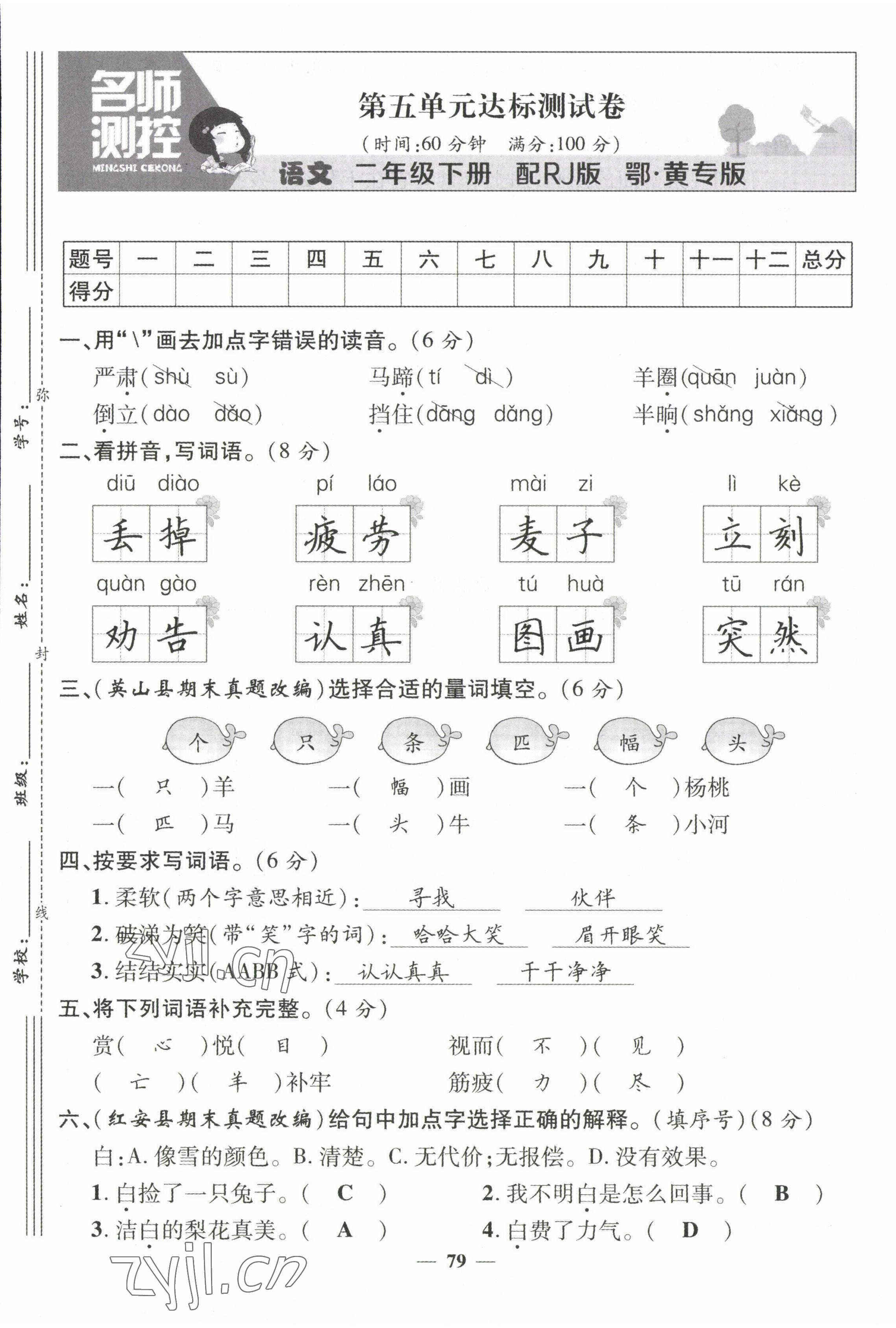 2022年名师测控二年级语文下册人教版鄂黄专版