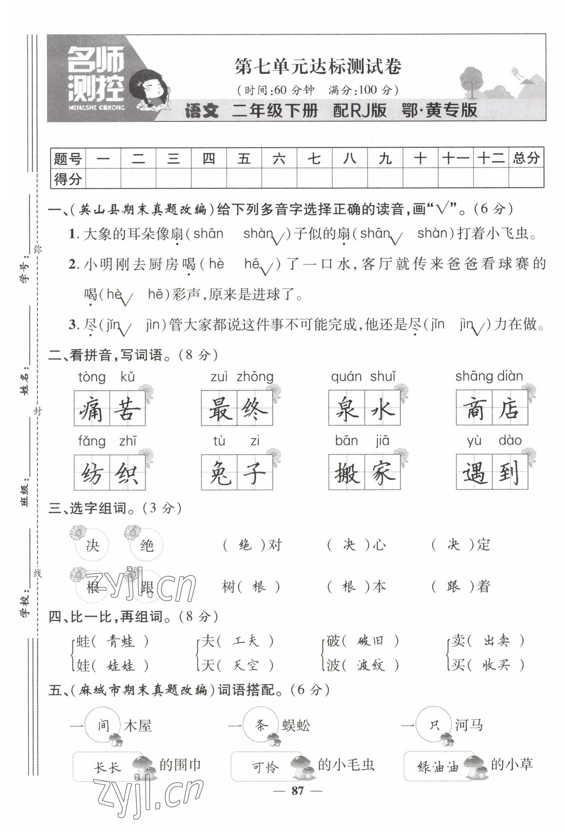2022年名师测控二年级语文下册人教版鄂黄专版