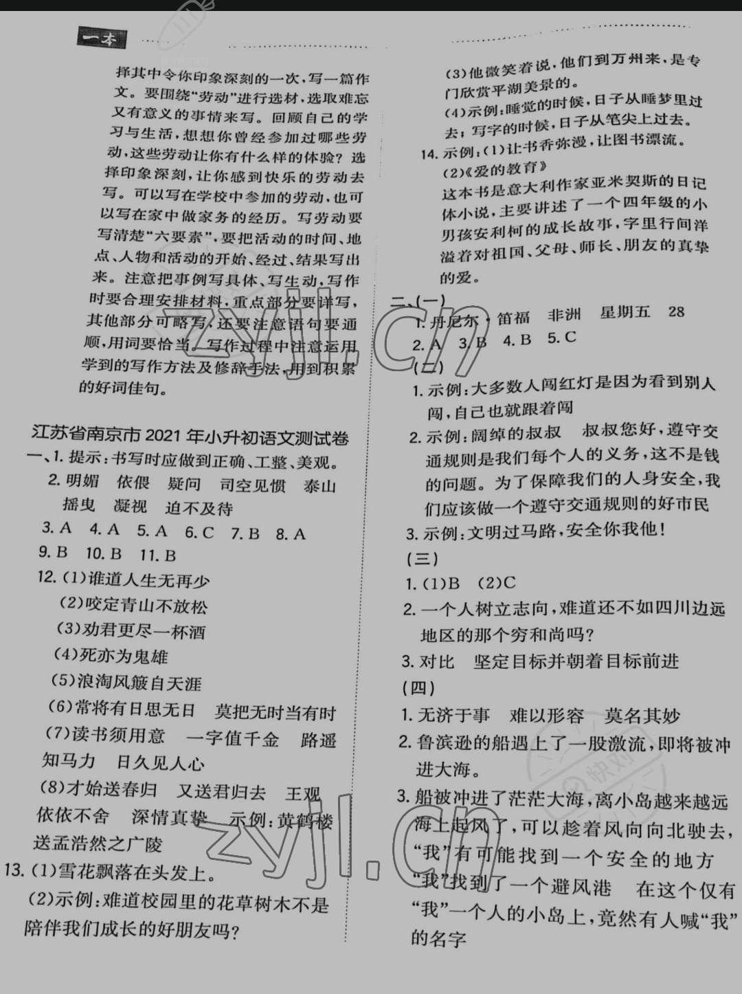 注:目前有些书本章节名称可能整理的还不是很完善,但都是按照顺序排列的,请同学们按照顺序仔细查找。练习册 2022年一本小升初冲刺新卷六年级语文福建专版 答案主要是用来给同学们做完题方便对答案用的,请勿直接抄袭。