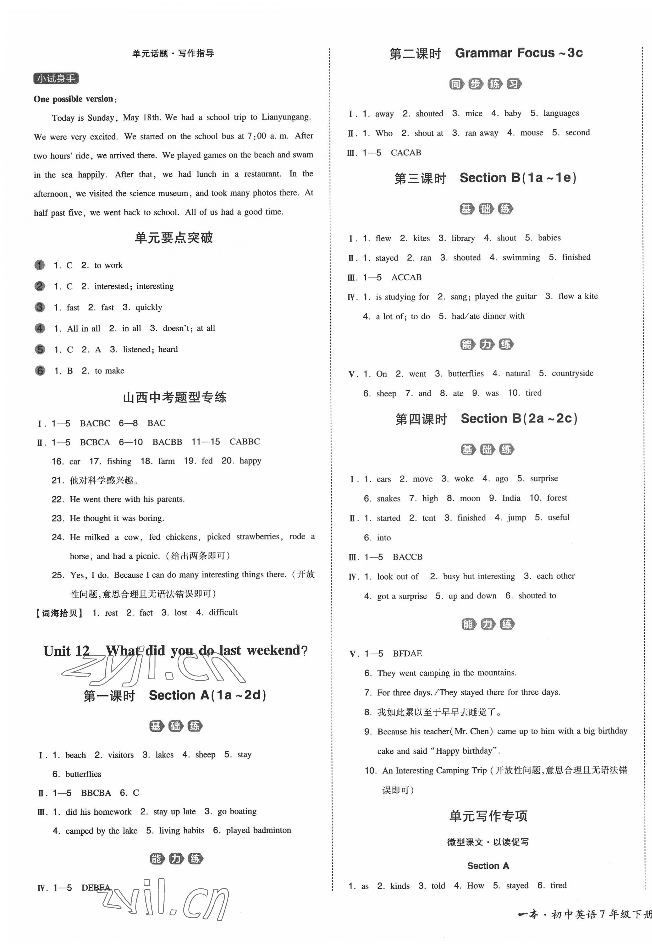 注:目前有些书本章节名称可能整理的还不是很完善,但都是按照顺序排列的,请同学们按照顺序仔细查找。练习册 2022年一本七年级英语下册人教版山西专版 答案主要是用来给同学们做完题方便对答案用的,请勿直接抄袭。