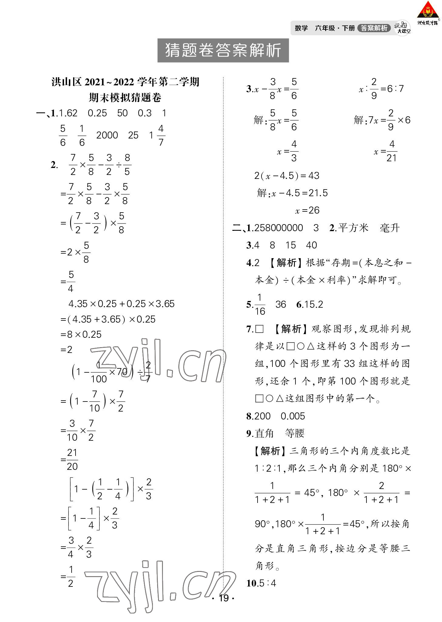 《2022年状元大课堂期末真题押题卷六年级数学下册人教版武汉专版》