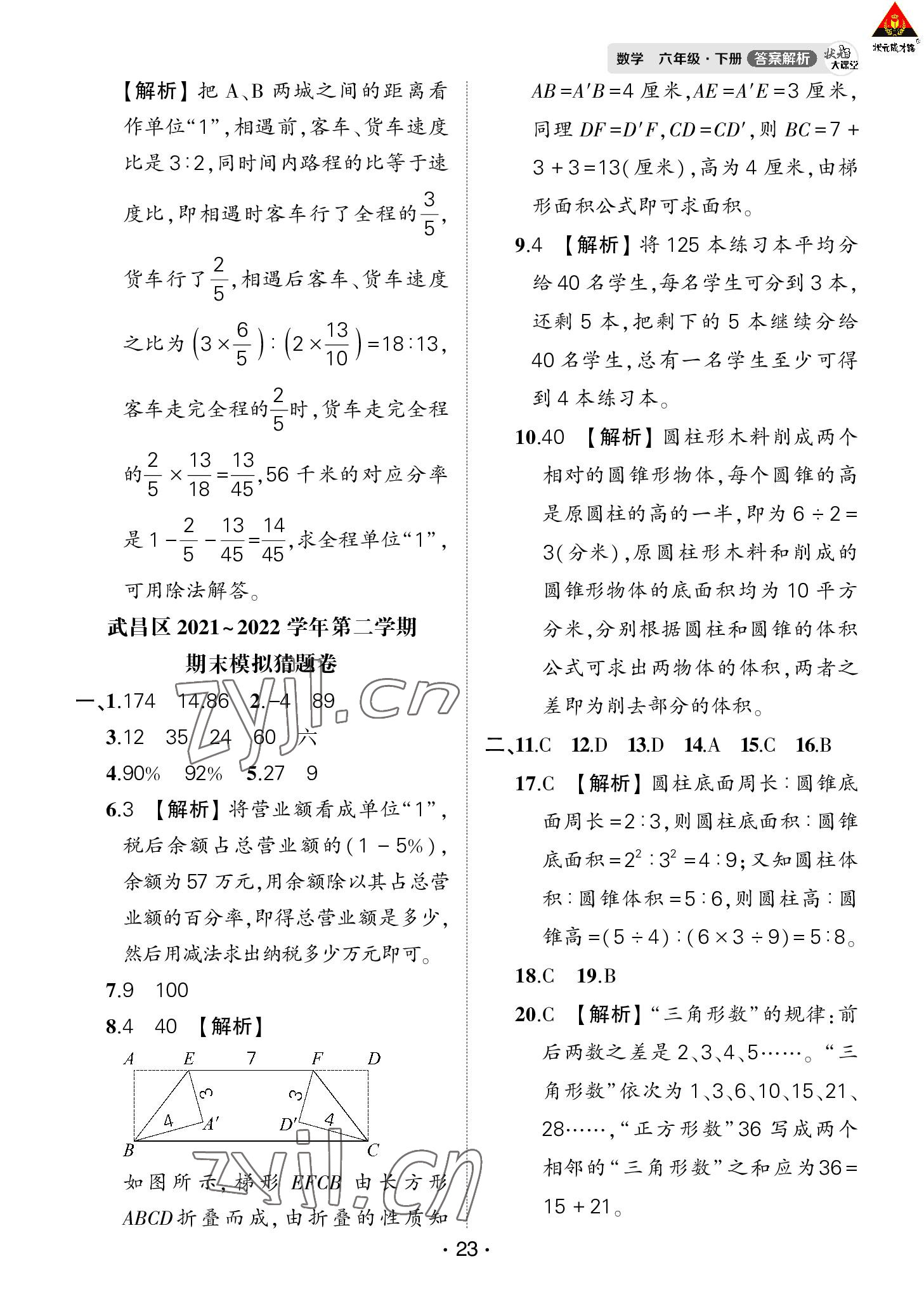 《2022年状元大课堂期末真题押题卷六年级数学下册人教版武汉专版》