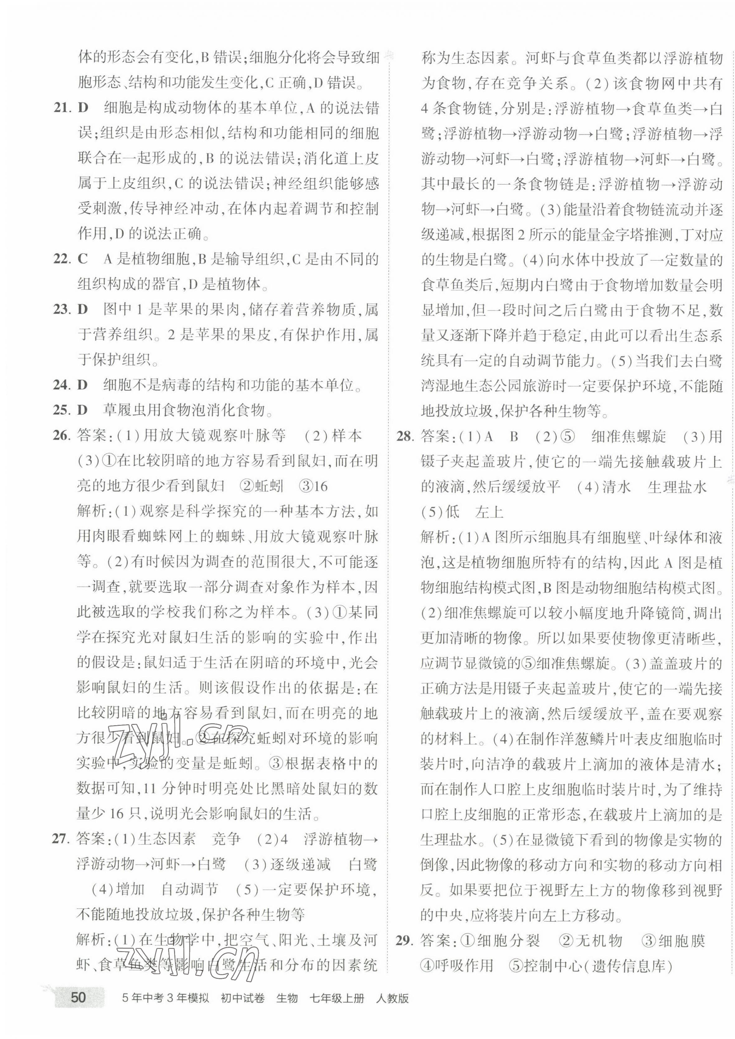 2022年5年中考3年模拟初中试卷七年级生物上册人教版