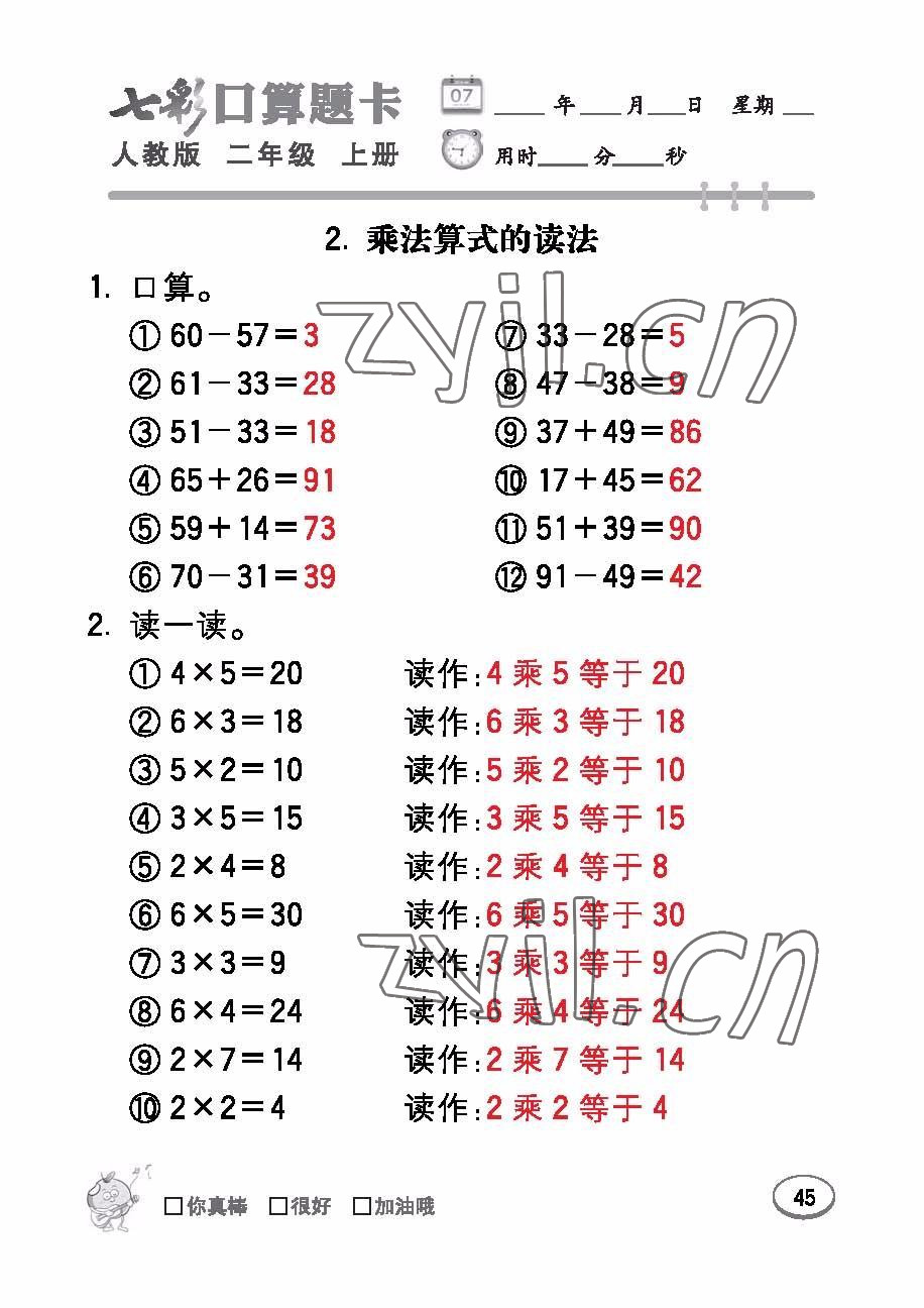 注:目前有些书本章节名称可能整理的还不是很完善,但都是按照顺序排列的,请同学们按照顺序仔细查找。练习册 2022年七彩口算题卡二年级数学上册人教版 答案主要是用来给同学们做完题方便对答案用的,请勿直接抄袭。